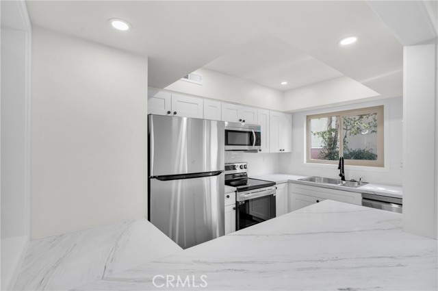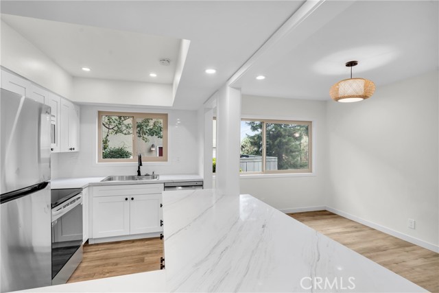 This bright and airy end-unit is updated throughout with newer windows, flooring, countertops, and stylish finishes and window treatments, making it both comfortable and modern. Downstairs, the open floorplan with living room and dining area welcomes you with sunny windows and features a cozy fireplace and access to the private patio. A sleek half bath off the living area is ideal for guests, while the bright kitchen has ample counterspace, a breakfast bar, and newer stainless-steel appliances. Upstairs two bedrooms, one with its own balcony, share a beautiful full bath with stackable washer/dryer and relaxing tub. Offering a pool, rec room, storage room, and two assigned parking spaces, this friendly condo community is near Sierra Madre’s quaint downtown, and centrally located to shopping, restaurants, and freeway access. Please note this is a non-smoking community.