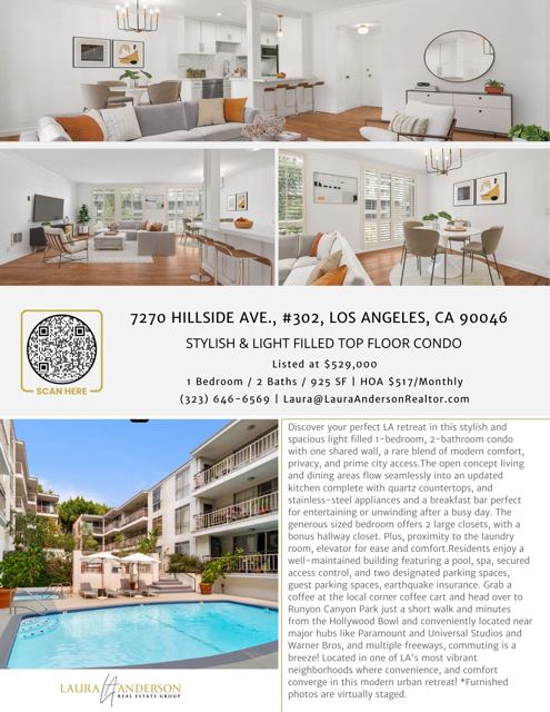 Great opporunity to own/rent this stylish and spacious light filled 1-bedroom, 2-bathroom condo with one shared wall, a rare blend of modern comfort, privacy, and prime city access.The open concept living and dining areas flow seamlessly into an updated kitchen complete with quartz countertops, and stainless-steel appliances and a breakfast bar perfect for entertaining or unwinding after a busy day. The generous sized bedroom offers 2 large closets, with a bonus hallway closet. Plus, close proximity to the laundry room, elevator for ease and comfort.Residents enjoy a well-maintained building featuring a pool, spa, secured access control, and two designated parking spaces, guest parking spaces, earthquake insurance. Grab a coffee at the local corner coffee cart and head over to Runyon Canyon Park just a short walk and minutes from the Hollywood Bowl and conveniently located near major hubs like Paramount and Universal Studios and Warner Bros, and multiple freeways, commuting is a breeze! Located in one of LA's most vibrant neighborhoods where convenience, and comfort converge in this modern urban retreat! *Furnished photos are virtually staged. When visiting the open houses please park in the 9 guest parking spaces behind the building ( enter thru the alley). *Available for lease at $2,900/month, security deposit of $2,900. No Smoking, Small dogs allowed upon landlord approval. $750 pet deposit. Applicant to Provide Credit Report, POF, Copy of Driver's License/Picture ID, Tenant to Provide Landlord with Renters Insurance. Credit Score of 700 or higher. *Furnished photos are virtually staged.* 24 hr. showing notice required. Available Now!*