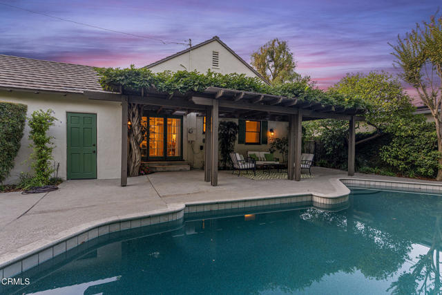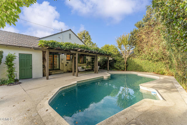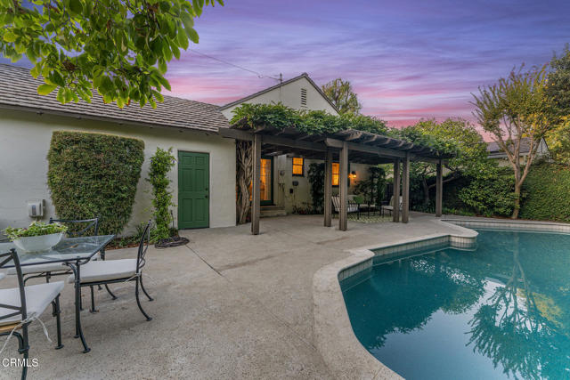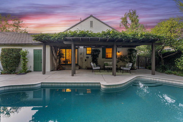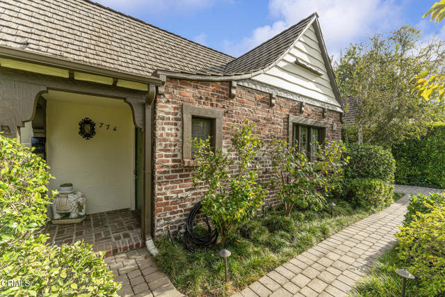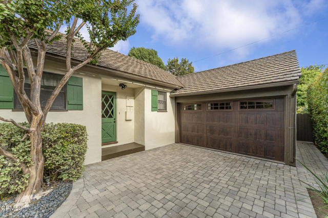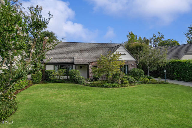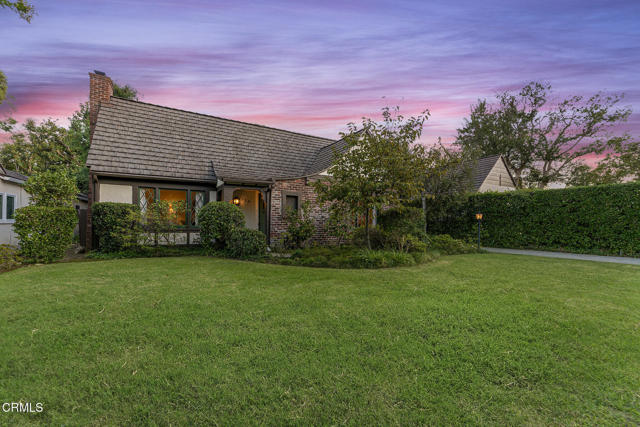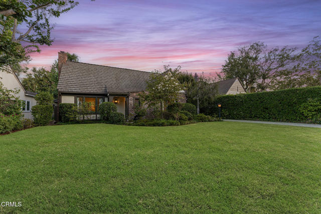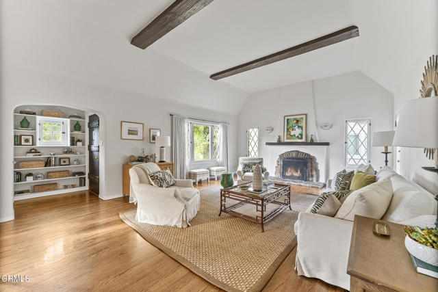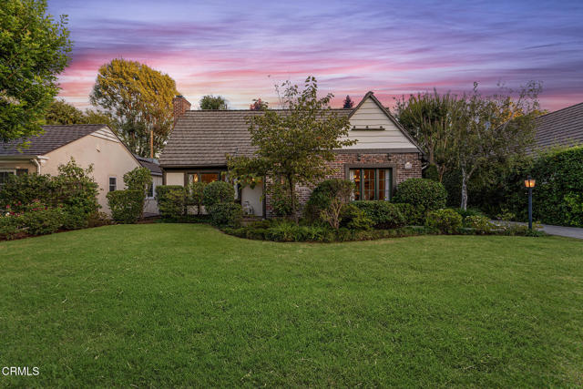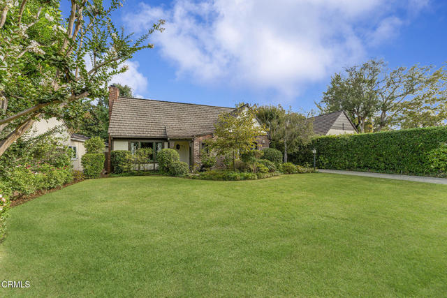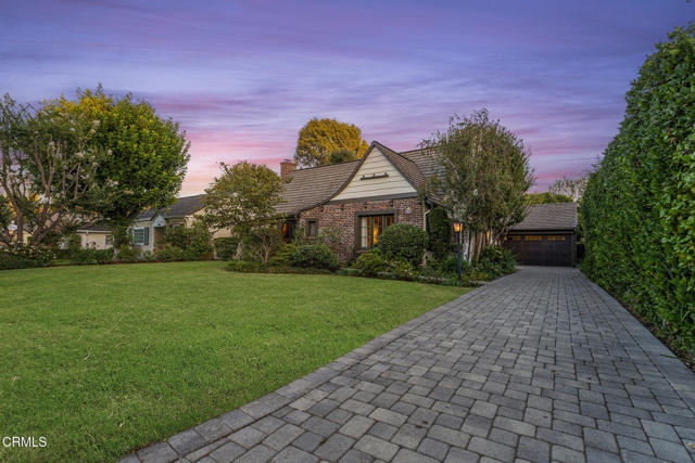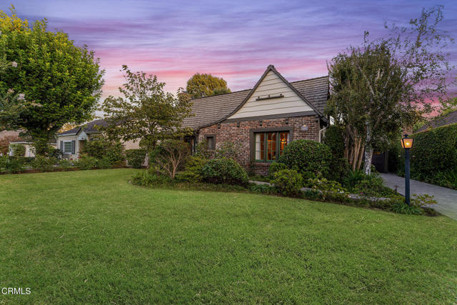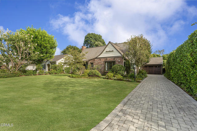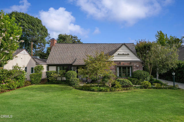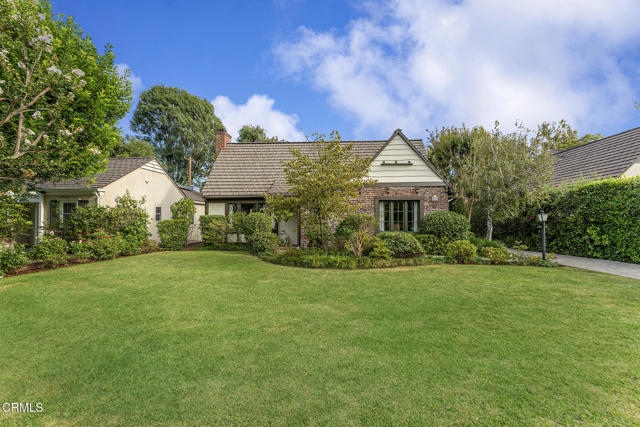 Nestled on a quiet street in San Marino's highly desirable Mission District, this English Cottage evokes the timeless charm of the countryside. With its steeply pitched roof, aged brick facade, and diamond-pane windows, the home radiates warmth and storybook appeal. A paver stone walkway meanders through lush flower beds to the inviting porch featuring arched wood beams that accent a vintage paneled door create a welcoming prelude to the home. Beyond the entry, built-in shelves and a petite view window lead into the dramatic living room, revealing soaring vaulted ceilings with exposed beams, gleaming hardwood floors, anchored by a striking stone fireplace with raised hearth and rustic wood mantel. A French door opens to the side patio, blending indoor and outdoor living. The formal dining room, illuminated by an opaque glass chandelier and abundant natural light, opens to the sunny breakfast room featuring a wrought-iron chandelier adorned with hand-painted ceramic accents, walls of cabinetry, a convenient prep sink, and a tiled serving counter that connects seamlessly to the kitchen--perfect for casual meals or morning coffee. The functional kitchen is appointed with tiled countertop, matching backsplash, and custom cabinetry. A versatile mudroom with laundry and an adjoining three-quarter bath adds everyday convenience, while a side door opens to the paver driveway that leads to the detached garage. A central hallway leads to the home's private quarters, where one bedroom features a walk-in closet and French doors to the side patio. At the end of the hall, a flexible primary suite can be closed off for added privacy and offers double closets, tranquil views of the backyard, and a primary bath with dual sinks. A third bedroom doubles as an office or den, enhanced by built-in bookcases and French doors that open to a wisteria-draped pergola--an enchanting setting for dining al fresco. The private backyard unfolds as an oasis of relaxation and leisure, with a sparkling pool surrounded by lush hedges and mature trees, offering the perfect retreat for lounging by the water or gathering with friends on warm evenings. Combining classic English charm with the best of California living, this quintessential cottage is truly your home sweet home!