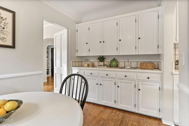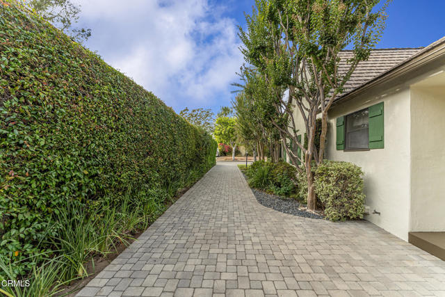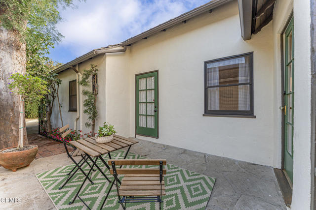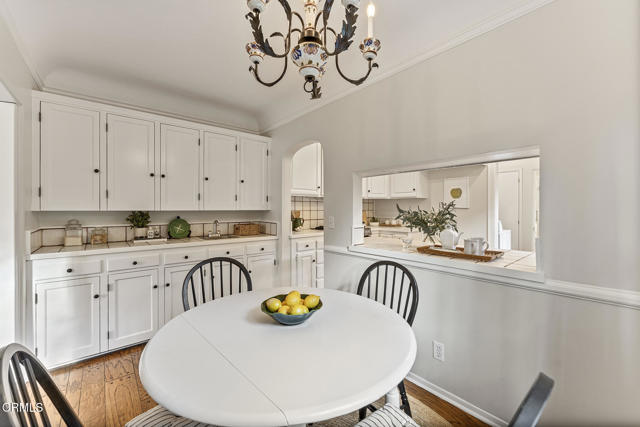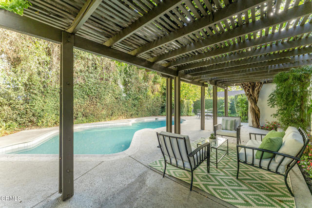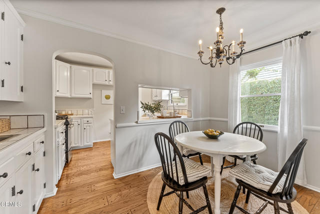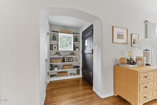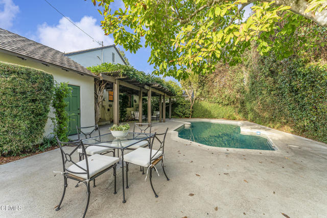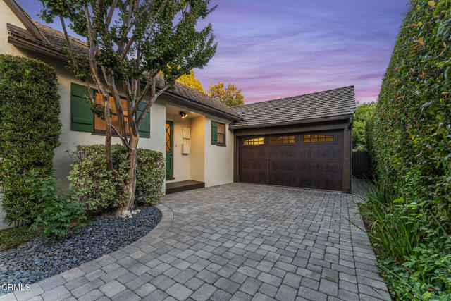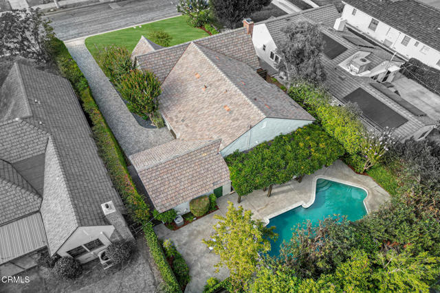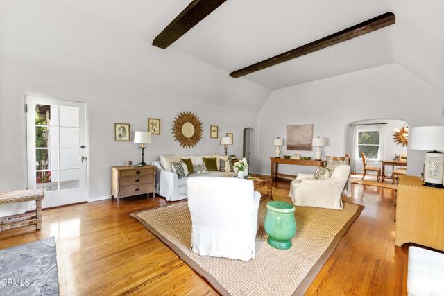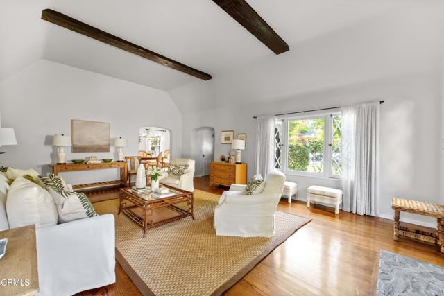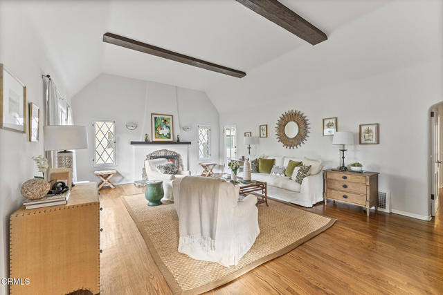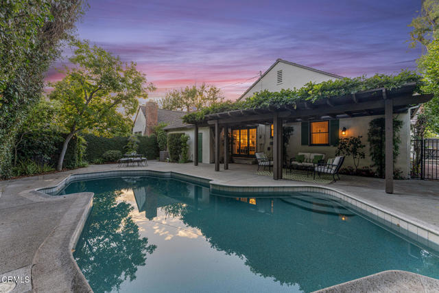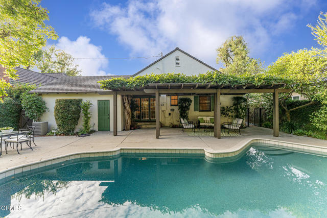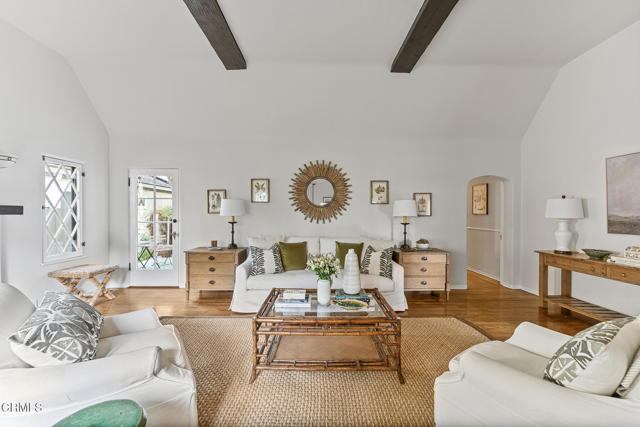 Nestled on a quiet street in San Marino's highly desirable Mission District, this English Cottage evokes the timeless charm of the countryside. With its steeply pitched roof, aged brick facade, and diamond-pane windows, the home radiates warmth and storybook appeal. A paver stone walkway meanders through lush flower beds to the inviting porch featuring arched wood beams that accent a vintage paneled door create a welcoming prelude to the home. Beyond the entry, built-in shelves and a petite view window lead into the dramatic living room, revealing soaring vaulted ceilings with exposed beams, gleaming hardwood floors, anchored by a striking stone fireplace with raised hearth and rustic wood mantel. A French door opens to the side patio, blending indoor and outdoor living. The formal dining room, illuminated by an opaque glass chandelier and abundant natural light, opens to the sunny breakfast room featuring a wrought-iron chandelier adorned with hand-painted ceramic accents, walls of cabinetry, a convenient prep sink, and a tiled serving counter that connects seamlessly to the kitchen--perfect for casual meals or morning coffee. The functional kitchen is appointed with tiled countertop, matching backsplash, and custom cabinetry. A versatile mudroom with laundry and an adjoining three-quarter bath adds everyday convenience, while a side door opens to the paver driveway that leads to the detached garage. A central hallway leads to the home's private quarters, where one bedroom features a walk-in closet and French doors to the side patio. At the end of the hall, a flexible primary suite can be closed off for added privacy and offers double closets, tranquil views of the backyard, and a primary bath with dual sinks. A third bedroom doubles as an office or den, enhanced by built-in bookcases and French doors that open to a wisteria-draped pergola--an enchanting setting for dining al fresco. The private backyard unfolds as an oasis of relaxation and leisure, with a sparkling pool surrounded by lush hedges and mature trees, offering the perfect retreat for lounging by the water or gathering with friends on warm evenings. Combining classic English charm with the best of California living, this quintessential cottage is truly your home sweet home!