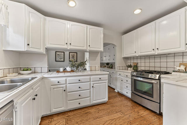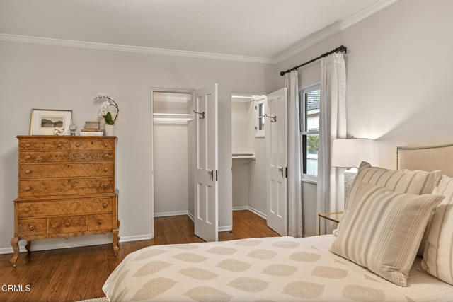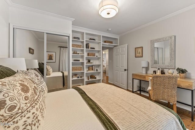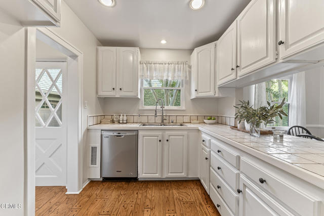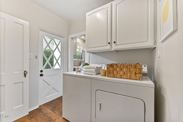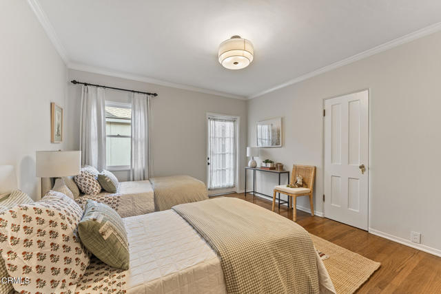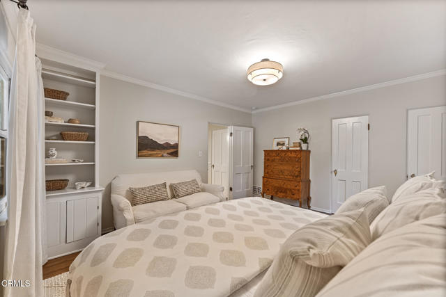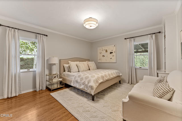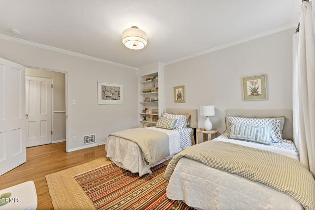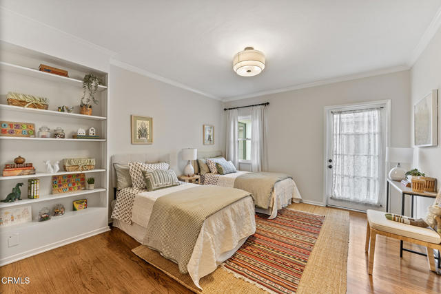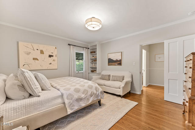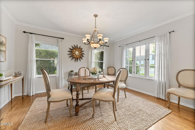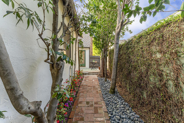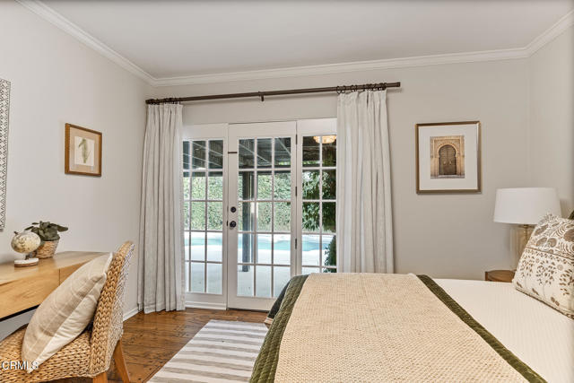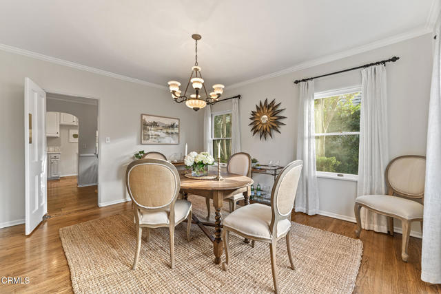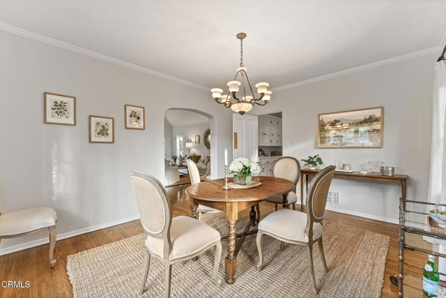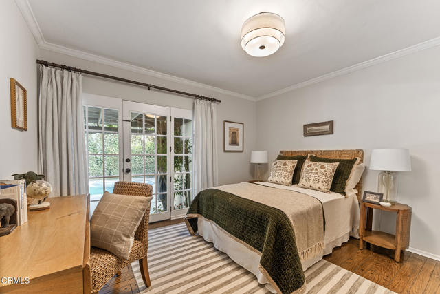 Nestled on a quiet street in San Marino's highly desirable Mission District, this English Cottage evokes the timeless charm of the countryside. With its steeply pitched roof, aged brick facade, and diamond-pane windows, the home radiates warmth and storybook appeal. A paver stone walkway meanders through lush flower beds to the inviting porch featuring arched wood beams that accent a vintage paneled door create a welcoming prelude to the home. Beyond the entry, built-in shelves and a petite view window lead into the dramatic living room, revealing soaring vaulted ceilings with exposed beams, gleaming hardwood floors, anchored by a striking stone fireplace with raised hearth and rustic wood mantel. A French door opens to the side patio, blending indoor and outdoor living. The formal dining room, illuminated by an opaque glass chandelier and abundant natural light, opens to the sunny breakfast room featuring a wrought-iron chandelier adorned with hand-painted ceramic accents, walls of cabinetry, a convenient prep sink, and a tiled serving counter that connects seamlessly to the kitchen--perfect for casual meals or morning coffee. The functional kitchen is appointed with tiled countertop, matching backsplash, and custom cabinetry. A versatile mudroom with laundry and an adjoining three-quarter bath adds everyday convenience, while a side door opens to the paver driveway that leads to the detached garage. A central hallway leads to the home's private quarters, where one bedroom features a walk-in closet and French doors to the side patio. At the end of the hall, a flexible primary suite can be closed off for added privacy and offers double closets, tranquil views of the backyard, and a primary bath with dual sinks. A third bedroom doubles as an office or den, enhanced by built-in bookcases and French doors that open to a wisteria-draped pergola--an enchanting setting for dining al fresco. The private backyard unfolds as an oasis of relaxation and leisure, with a sparkling pool surrounded by lush hedges and mature trees, offering the perfect retreat for lounging by the water or gathering with friends on warm evenings. Combining classic English charm with the best of California living, this quintessential cottage is truly your home sweet home!