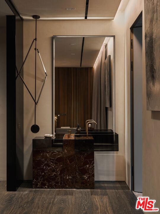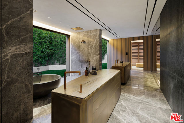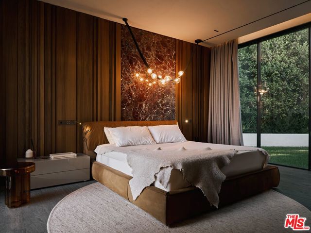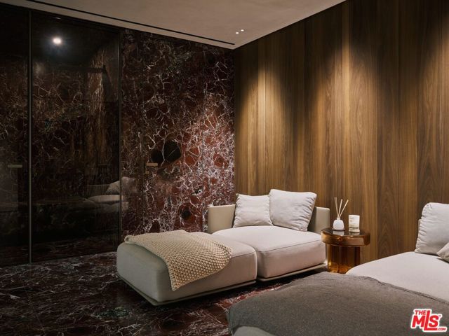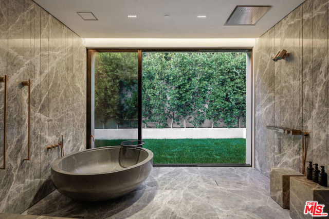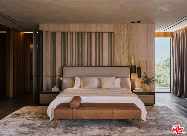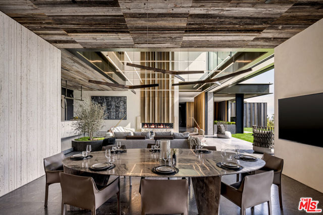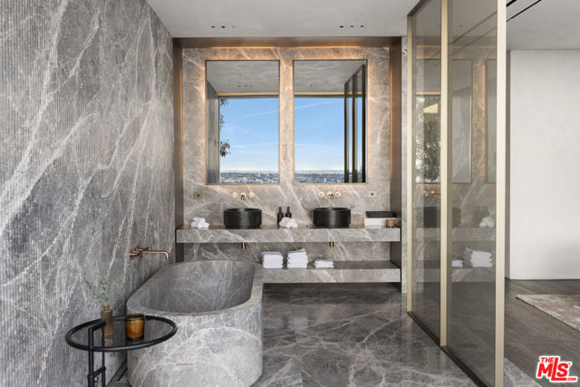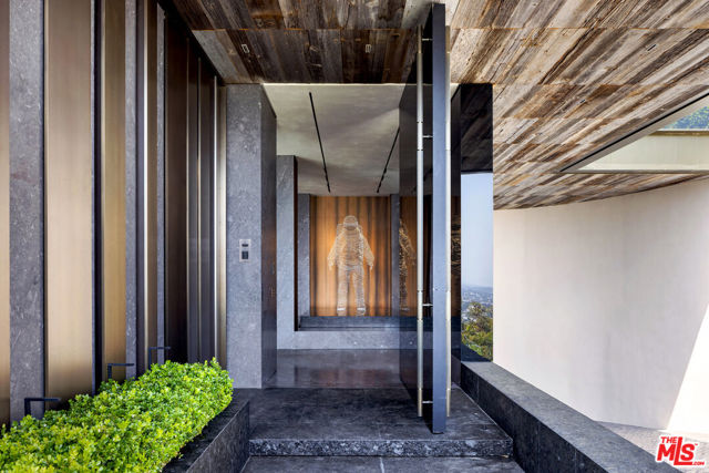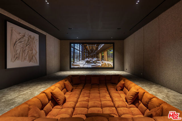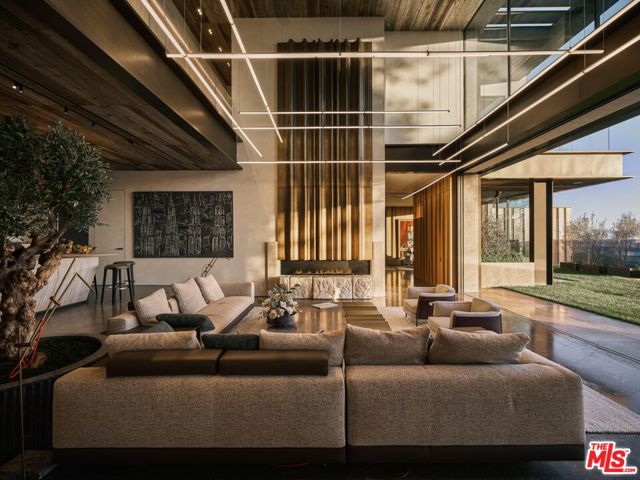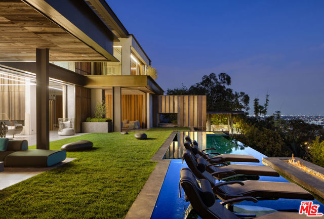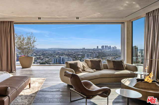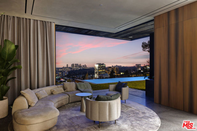 Meticulously crafted by NOBEL Design and Architecture Studio, this contemporary estate spans approximately 14,000 SF and sits privately on a rare one-acre parcel in the coveted Bird Streets. Positioned to command uninterrupted sightlines from the Pacific Design Center across West Hollywood and onward to the Downtown skyline, the property is quietly dramatic, unfolding through a series of intricately designed living spaces.The interior opens into soaring ceilings and walls of glass that frame the surrounding landscape and allow light to move fluidly throughout the day, casting intentional shadow and depth across every surface. The voluminous open floor plan creates a continuous dialogue between interior spaces and the outdoors. A grand formal living room is anchored by a double-height fireplace wrapped in ribbed travertine and custom iron detailing, while nearby, a more intimate lounge and bespoke bar area provide the perfect setting for evening gatherings. These spaces flow seamlessly into the dining area and kitchen, allowing for effortless hosting. The custom chef's kitchen serves as both a functional workspace and a visual focal point, outfitted with top-tier appliances and center island. Positioned to overlook the living and dining rooms, it maintains a strong connection to the heart of the home while remaining grounded in craftsmanship.The primary suite is a true sanctuary, defined by generous volume and quiet privacy, and features a large walk-in wardrobe alongside an indulgent bath complete with dual vanities, a stone soaking tub, and an oversized shower. Each of the additional four bedrooms is proportioned for comfort and includes its own en-suite bath, offering privacy and flexibility for family or guests. Health and wellness were thoughtfully integrated into the design, with a dedicated spa and salon area finished in richly toned burgundy marble, accompanied by an expansive terrace that opens to sweeping views. A striking movie theater, designed with sunken seating and a subtle nod to 1970s, offers a completely immersive experience.Outdoor spaces are as intentional as the interiors. A long, linear pool extends toward the horizon, fitted with heated in-water lounge chairs that invite hours spent suspended above the view. Broad, level lawns create rare usable outdoor ground, ideal for open-air dining or recreation, while mature landscaping frames the property without obscuring its outlook.Privately gated with parking for up to ten vehicles, the estate offers immediate access to the energy of the Sunset Strip and the amenities of Beverly Hills. It is a residence defined not by excess, but by precision where architecture, environment, and experience align with uncommon clarity.
