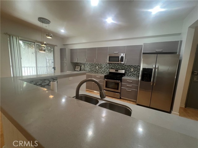 Beautiful end unit of condo complex with excellent condition! Very bright and airy inside! It's like 2 large master bedrooms with it's own bathrooms and one extra bathroom for guests. Great area in Korea Town! Very convenient location for all shopping and markets!!! High quality hardwood flooring through out. Beautiful kitchen with island and recessed lights. Electric fire place in living room Extra wide hallway makes you comfortable and safe. Recreation room that you can use like your own is right next door. Refrigerator, stacked washer & dryer are included. Please view a Virtual Tour below for more details.