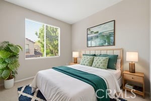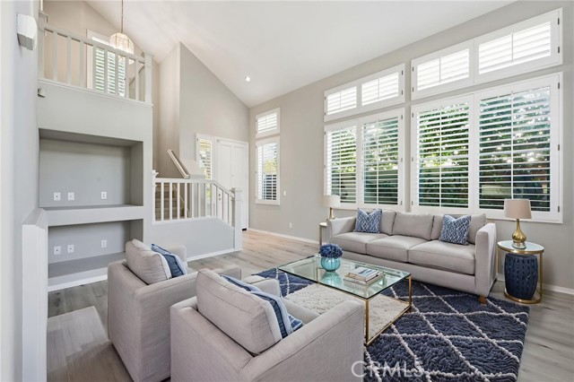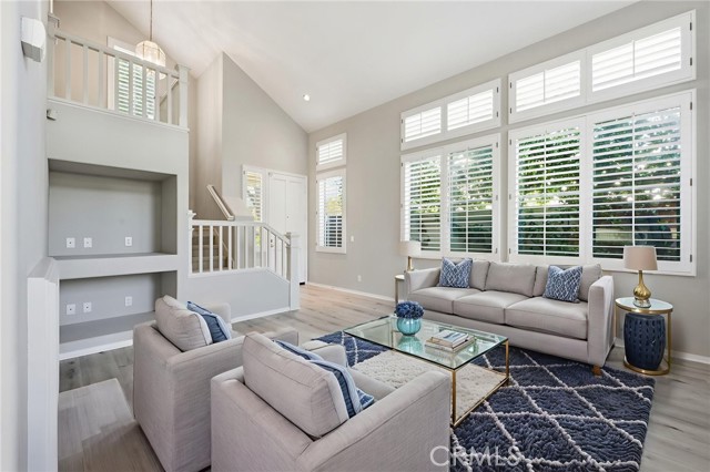 A delightful 3 bedroom 2.5 bath detached home on a condo plan located on one of the larger lots in the convenient Sancerre neighborhood. This corner location has neighbors only on one side. Vaulted ceilings with clerestory windows and custom shutters allow for lovely natural light in the living room. The color choices are in a complementary neutral palette. The patio is landscaped for privacy. There is a powder room and closet in the hallway leading to the 2 car garage. The driveway is long and able to fit guests cars. The bedrooms are all upstairs. The primary bedroom has a walk in closet and en-suite bath with double sinks, On the other side of the hallway bath are 2 bedrooms. This home is located close to the community pool and picnic area and close to guest parking. Sancerre community is convenient to John Wayne Airport, freeways and tollroads, Newport Center, Fashion Island, Newport Coast Community Center, Colleges and of course the Beach.