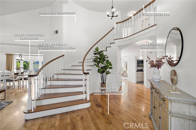 HAVE YOU BEEN LOOKING FOR A SPACIOUS, UPDATED HOME IN A WONDERFUL COMMUNITY? WELCOME TO THIS STUNNING 6-bed, 3-bath POOL HOME nestled in the TRANQUIL HILLS OF TRABUCO CANYON. Offering approximately 3,200 square feet of beautifully upgraded living space, this residence combines comfort, style, and functionality. The open and inviting floor plan features a convenient downstairs bedroom and bath, perfect for guests or multi-generational living. Recent updates include new carpet, a whole-house repipe, new water heater, fresh paint throughout, and dual-pane windows for energy efficiency. The home showcases elegant hardwood floors with custom ¾-inch real wood stairs, along with new exterior and interior doors. The remodeled kitchen and all three bathrooms have been thoughtfully updated with modern finishes, including a luxurious primary bath completed this past summer. Outside, enjoy the beautifully designed pavered driveway and walkway, a backyard hardscape with flower beds, and a sparkling lap pool with a large spa that accommodates 8–10 people. The slightly elevated backyard offers a touch of hillside view without the premium price. Additional highlights include a large solar system for low utility costs and a pull-down attic ladder providing extra storage space. Located in a quiet, friendly neighborhood with great community amenities, this home is close to shopping, dining, parks, and top-rated schools—yet far enough from the freeway to enjoy peaceful hillside living.