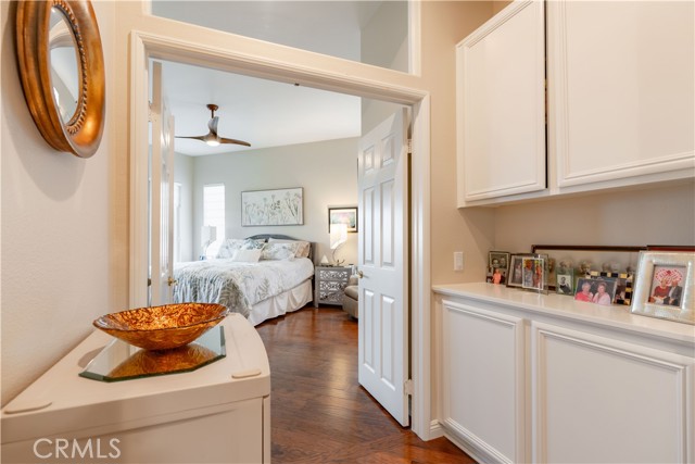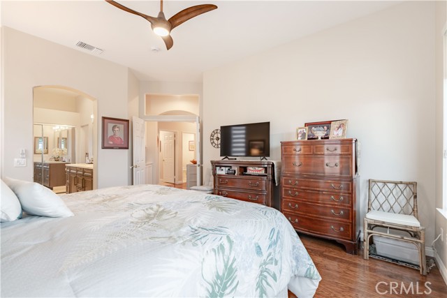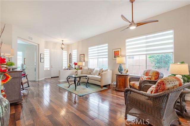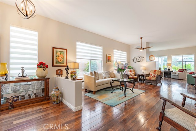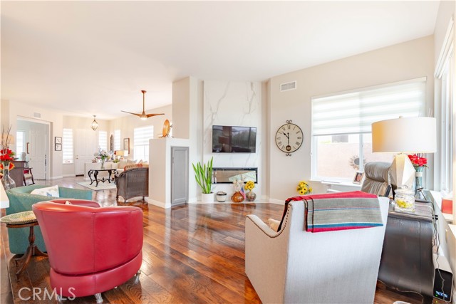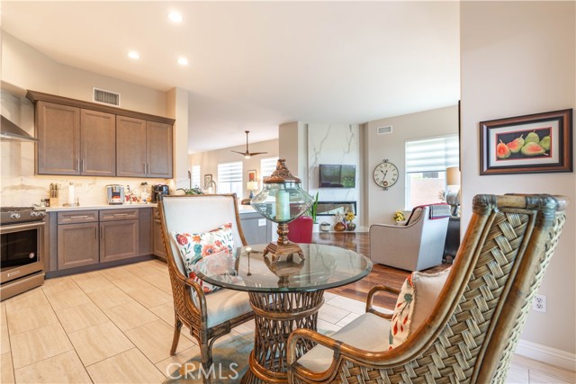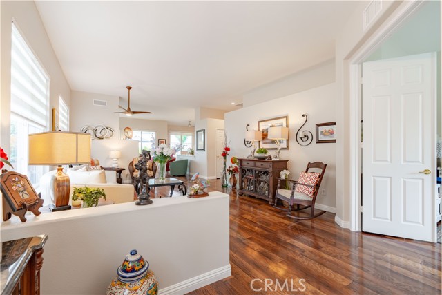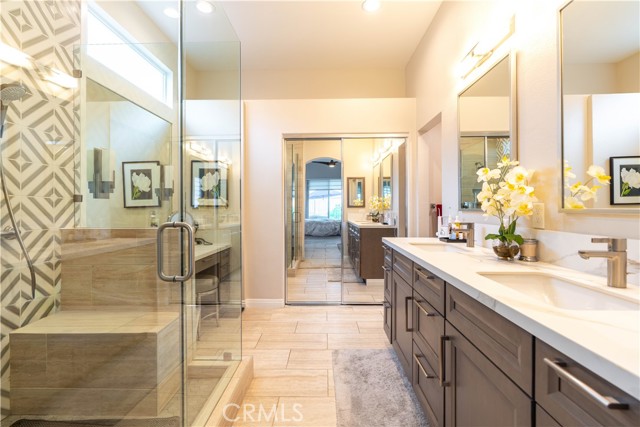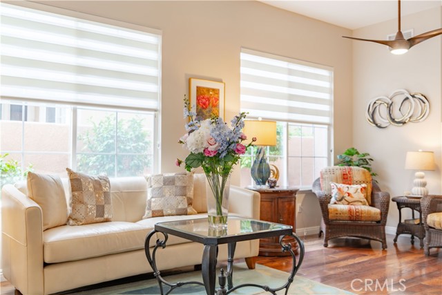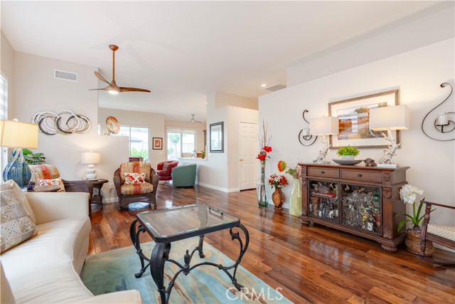 Welcome home to coveted guard-gated Palmia. This desirable floor plan in the Vistas is a gorgeous, COMPLETELY REMODELED single level with 2 primary bedrooms boasting private en-suite baths + guest bath. Home features neutral paint, open, flowing floorplan & lots of windows & view from back yard! Kitchen is STUNNING with upgraded slow-close cabinets & drawers, stainless steel appliances & plenty of counter & cabinet space. Kitchen flows seamlessly to living room. Living room boasts rich hardwood flooring, cozy electric fireplace & custom window coverings. Living room is open & bright & overlooks private back yard with a VIEW!. The larger of the 2 bedrooms is so spacious with an AMAZING remodeled en-suite bathroom including walk-in shower & vanity. The 2nd bedroom is also spacious with a completely remodeled en-suite large bath. Guest bath is open & modern with gold accents. Palmia is an amazing guard-gated community with 18-hole putting green, huge pool & spa, clubhouse, gym, tennis + so much more - all included in the rent. Great location close to shopping, toll road, hiking & biking trials. Truly an amazing opportunity!