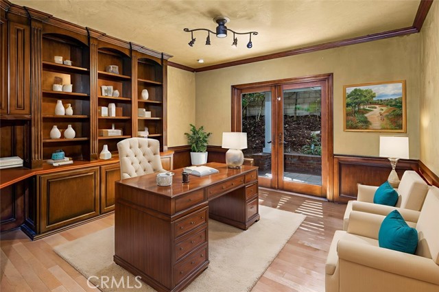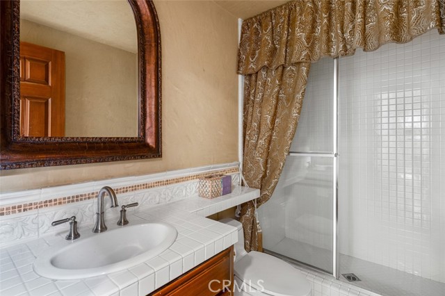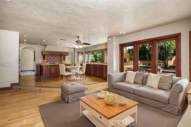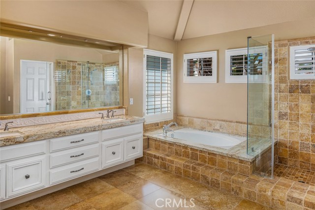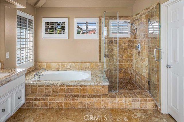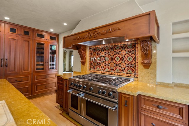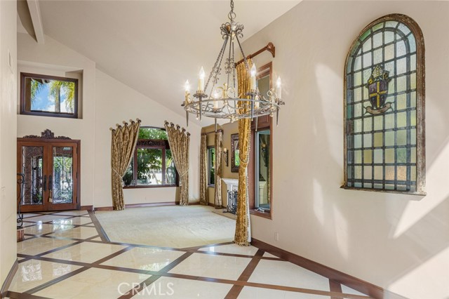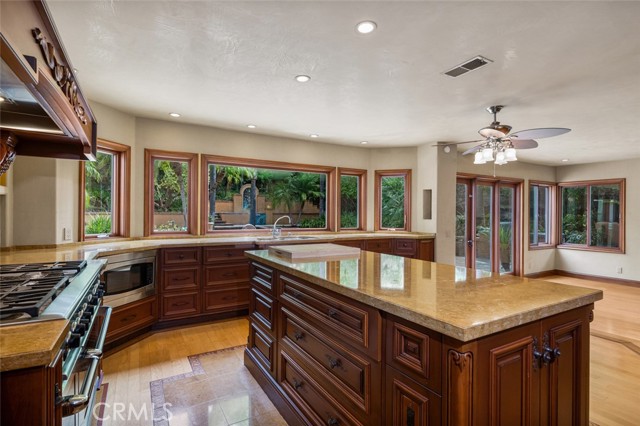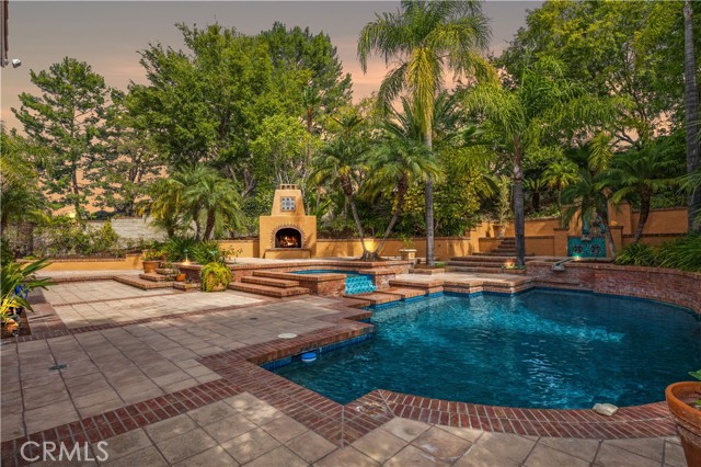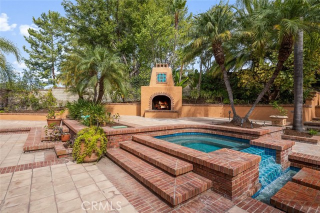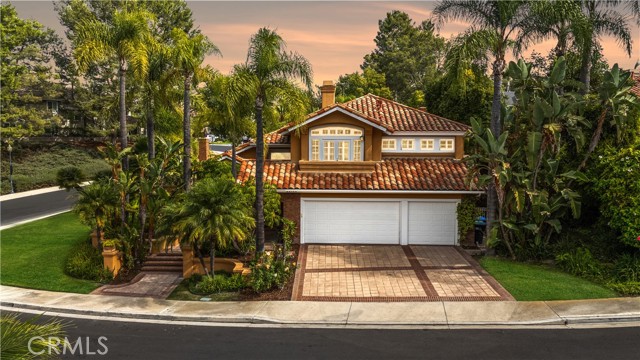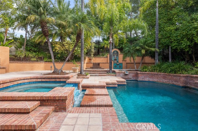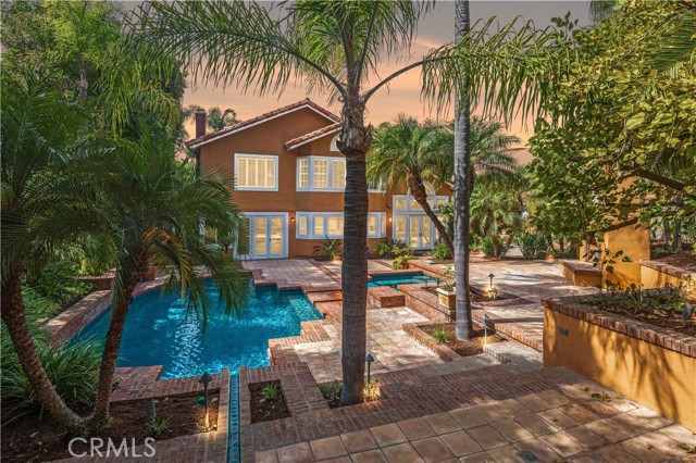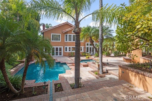 Rare and Private Corner Lot that measures over 10,000 square feet in the prestigious guard gated community of Canyon Crest’s Gallery Collection. This Mediterranean style home has one of the most impressive and serene backyard spaces that you will find. Custom brick and concrete architectural hardscape surround the pebbletec pool and spa, outdoor gas fireplace with mosaic tile and a top tier lounge area with a stunning water feature that streams down into the pool. The grass area and lush landscaping surround the entire property, creating total privacy and seclusion. This exceptional home presents towering vaulted ceilings, elegant stone inlay floors, Dual Pane wood clad windows with beautiful wood casings, plantation shutters, wrought iron stair rail, 3 gas fireplaces and an exceptional open concept floor plan with a downstairs bedroom/office and full bathroom. Your stunning chef’s kitchen overlooks the massive rear yard and features custom cabinetry, Sub Zero refrigeration, commercial Decor range and lime stone countertops. Traversing upstairs, you will find a huge bonus room with vaulted ceilings, two generous guest bedrooms that share a jack and jill bathroom and your stunning primary suite. The primary bedroom showcases a private balcony, a large walk-in closet and a luxurious remodeled primary bathroom with a soaking tub and separate glass enclosed shower. The Canyon Crest community offers unparalleled amenities including but not limited to: A beautiful clubhouse, fitness facility with dry saunas, tennis & pickleball courts, an amazing lap pool and kids pool, basketball court, tot lot, BBQ area, green space, billiards room, plus membership to Mission Viejo Lake.