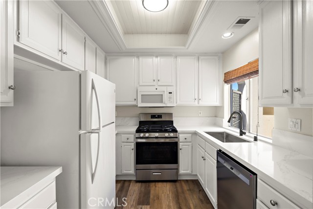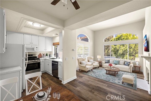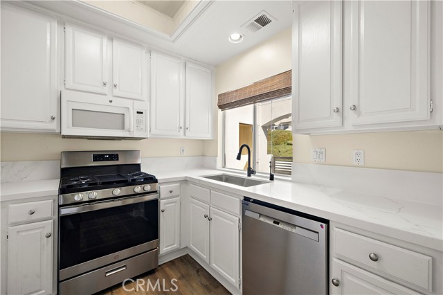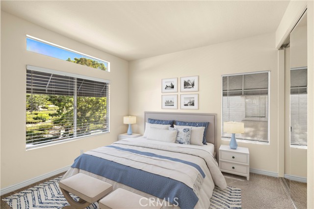 Newly refurbished Mirador upper-level condo with no upstairs neighbor. Bright and cheerful with lots of natural light. Luxury plank vinyl flooring in living room, kitchen, dining area and hallway. Carpet in bedrooms. Living room with fireplace, Adjacent dining area with new fan light. Kitchen with new quartz counter tops and new ranch style sink, gas range, microwave and dishwasher. Neutral decor throughout. Both bathrooms have new quartz counter tops and sinks, and both have new toilets as well. Spacious master bedroom has 2 closets with mirrored closet doors. The second bedroom has a wardrobe closet, double entry doors and could make an ideal office space as well. The home has central heating and AC. The private front balcony features a storage closet and lattice gate. Parking is a reserved carport #193 and features a large closet for storage of trash container. HOA fees include water and trash. The Mirador community features its own pool and spa and the property is also included in the Rancho Niguel Master Association with many additional amenities. The location of the property is ideal with easy access to the 73 Toll Road, Shopping, restaurants, theaters. Walking distance to an elementary school.