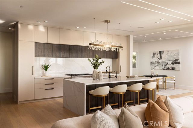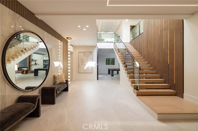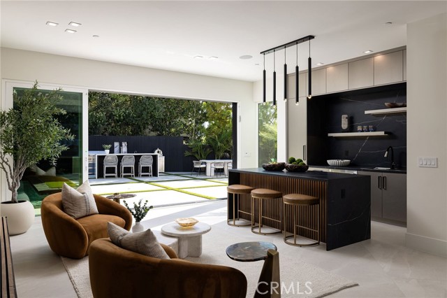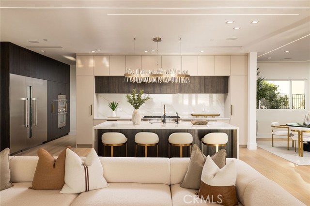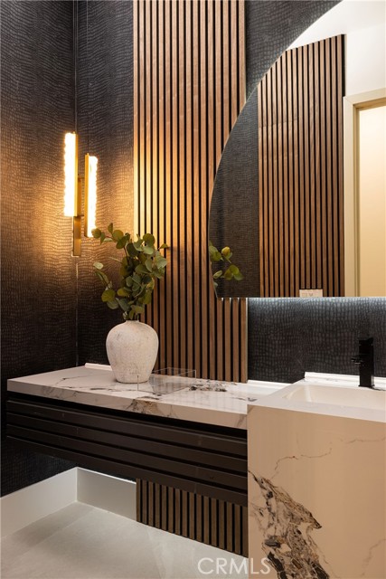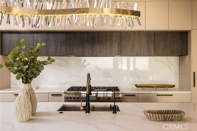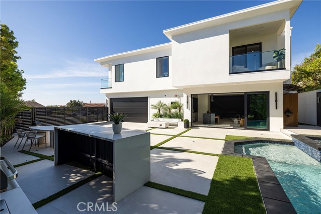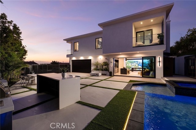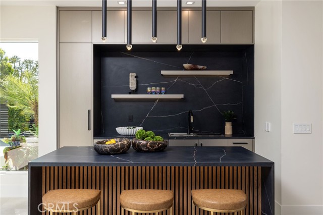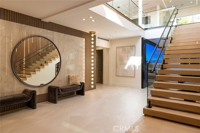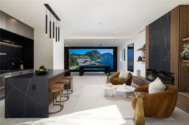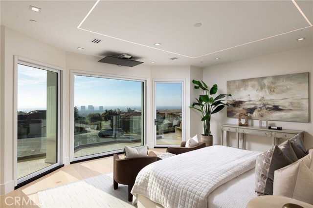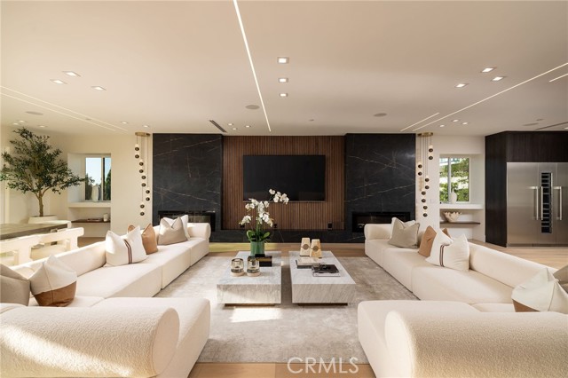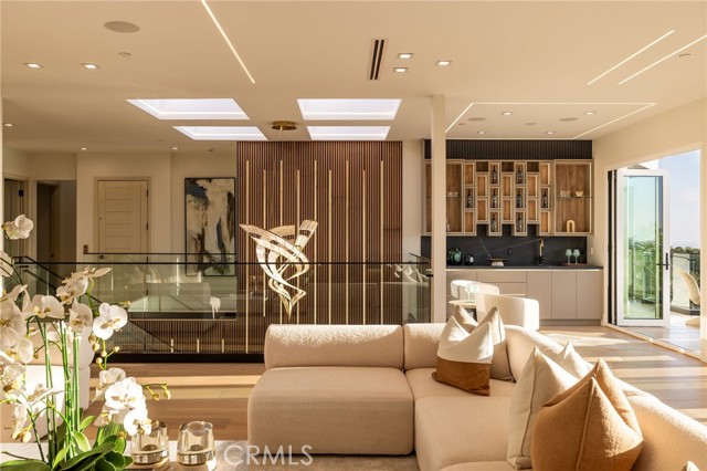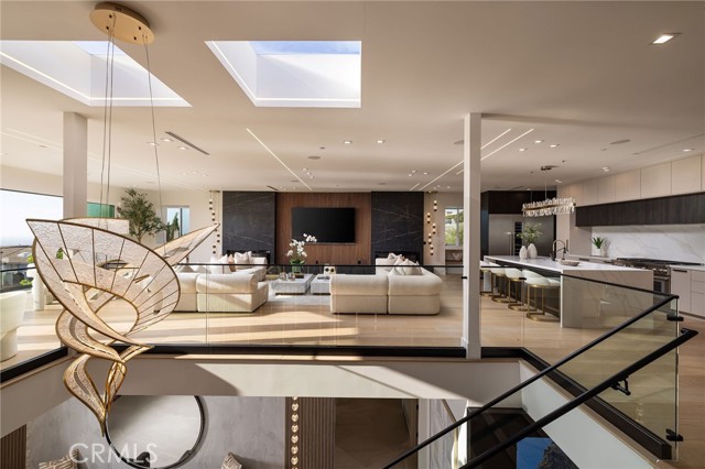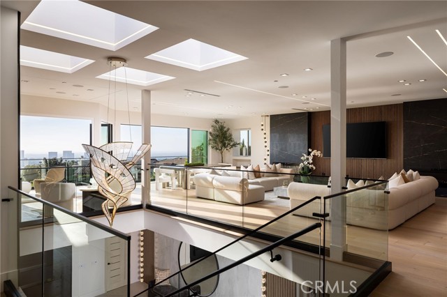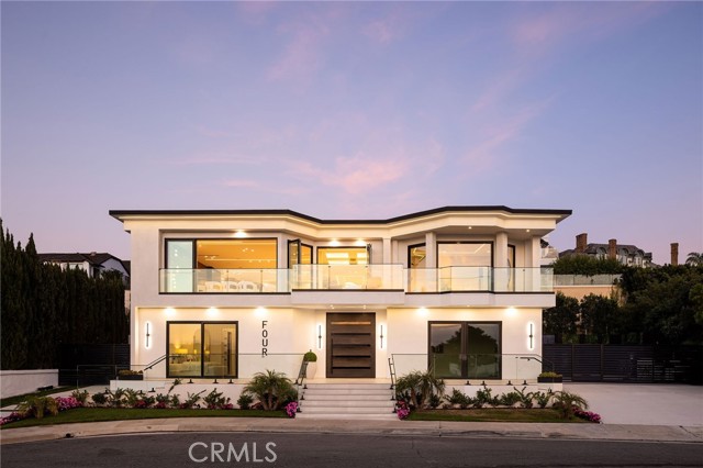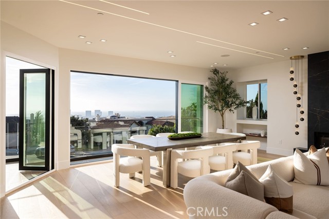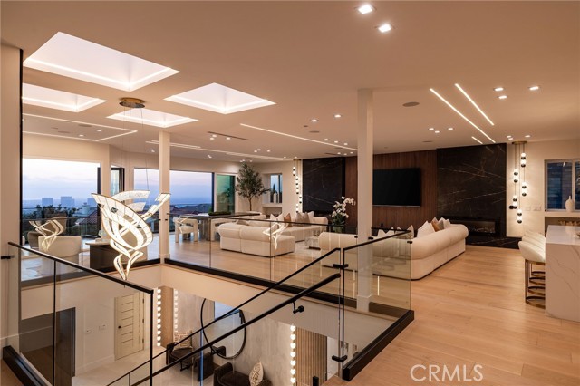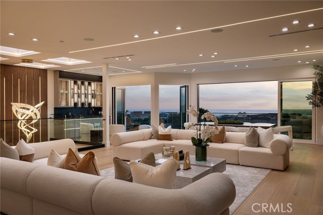 An extraordinary vantage point of ocean, harbor, island, and city lights defines this exceptional coastal estate—where sweeping panoramas of the Pacific, Catalina Island, Newport Harbor, and the Los Angeles skyline become a daily backdrop. Set within the guard-gated community of Harbor Ridge, this newly transformed residence rests at the end of a quiet cul-de-sac, offering a rare sense of seclusion paired with architectural sophistication. A private entry gate and statement front door introduce interiors that are both striking and inviting, where clean-lined design meets warmth and livability. Expansive living spaces unfold with an emphasis on light, scale, and flow, seamlessly connecting to the outdoors. The main level hosts three well-appointed bedrooms, including a junior suite positioned to capture ocean views, while two additional bedrooms enjoy a tranquil setting alongside a custom water feature. A refined lounge with a fireplace, built-in bar, and media wall creates an intimate yet elevated space for gathering. Upstairs, the home is thoughtfully arranged to prioritize both privacy and experience. The primary suite is positioned to fully embrace the panoramic views, wrapped in glass and complemented by a spa-caliber bath and a custom, boutique-style dressing room. An additional bedroom—currently utilized as a private office with its own balcony—offers flexibility without compromising the home’s overall layout. The culinary spaces are designed with intention and distinction, featuring a front-facing chef’s kitchen alongside a fully equipped secondary prep kitchen. These spaces anchor a series of formal and informal living areas, enhanced by dual fireplaces, a dedicated dining setting, and expansive sliding and bi-fold doors that create a seamless transition to the exterior. Outdoors, the property unfolds as a meticulously designed retreat. A resort-caliber pool and spa are framed by layered water features, complemented by a dry sauna, outdoor kitchen, fire feature, and multiple areas for lounging and dining—each element curated to elevate both entertaining and everyday living. With its commanding views, refined design, and coveted guard-gated setting, this residence represents a rare offering within one of Newport Beach’s most sought-after enclaves.
