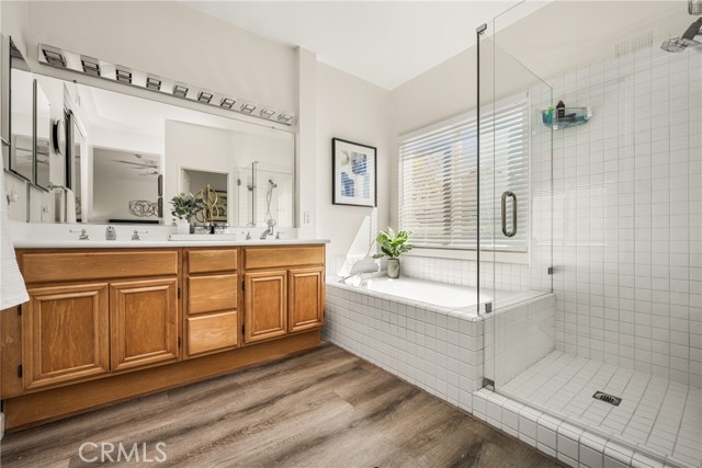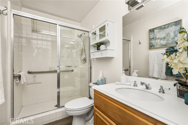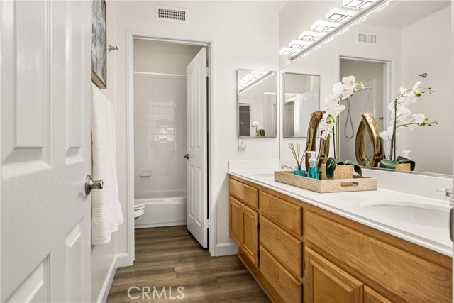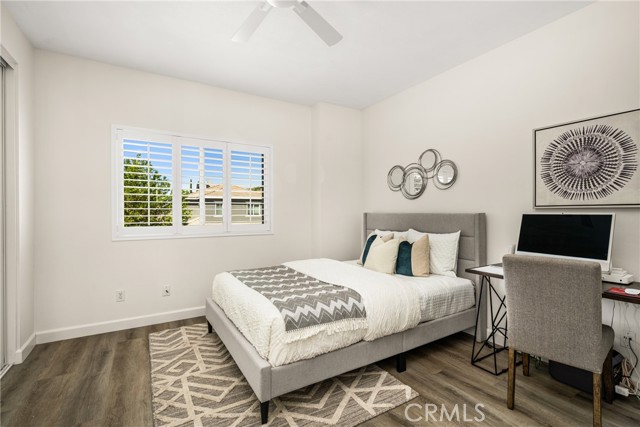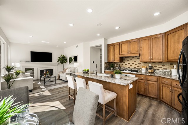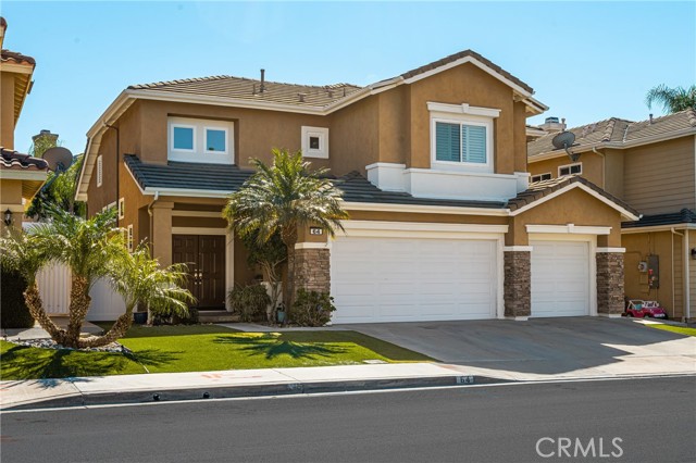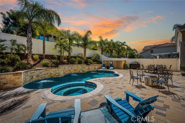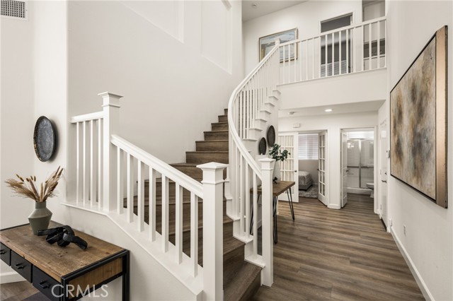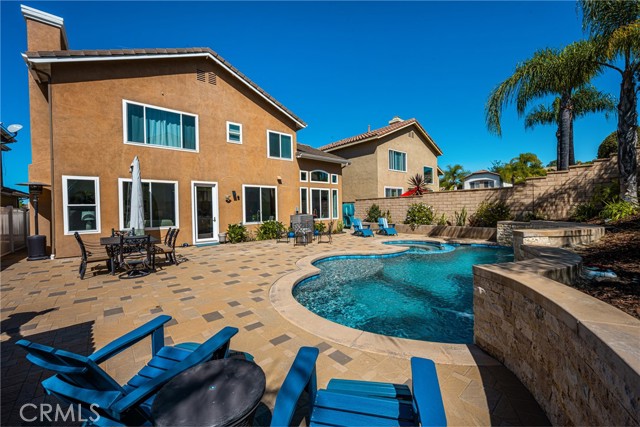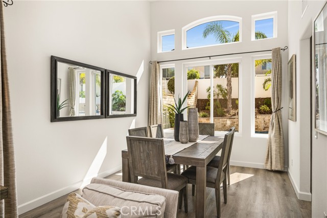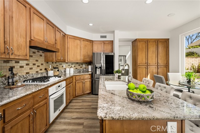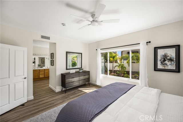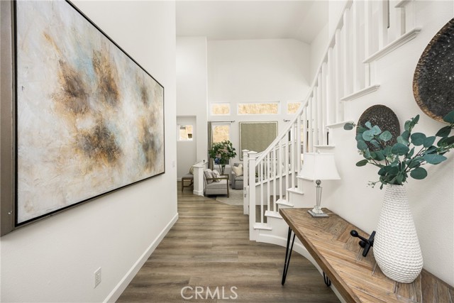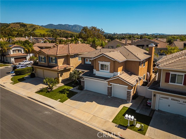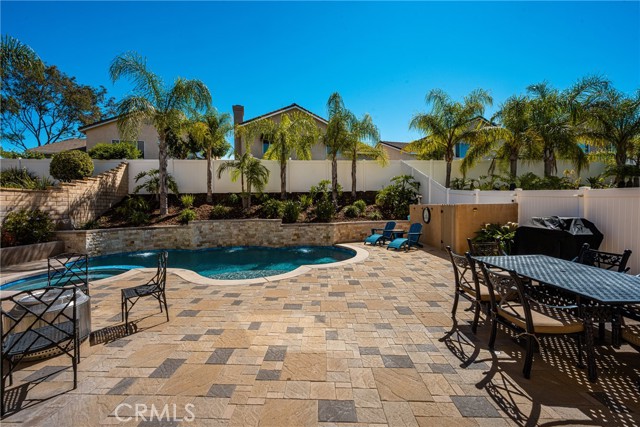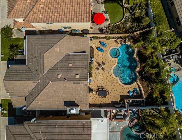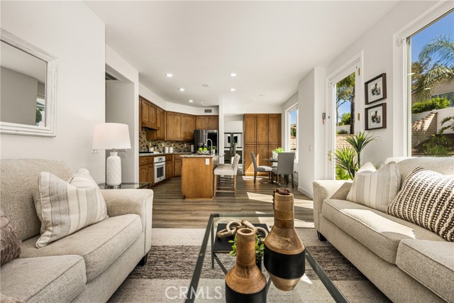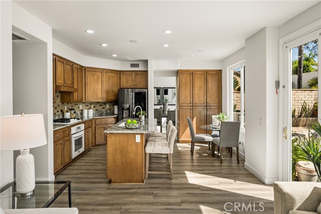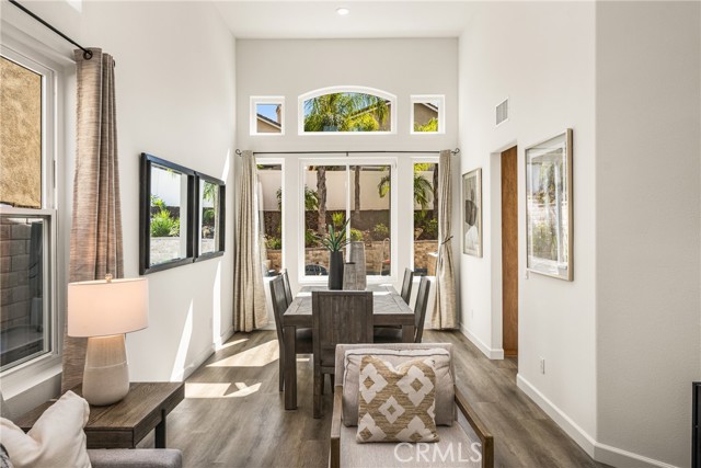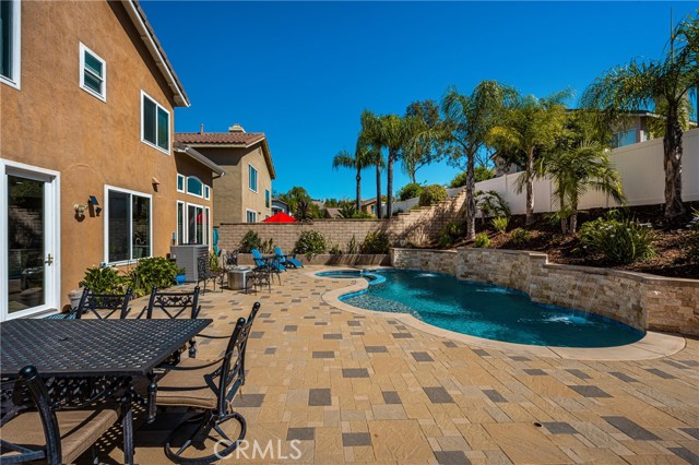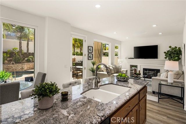 Beautifully upgraded and move-in ready, this Foothill Ranch home offers a flexible and highly desirable floor plan featuring a downstairs bedroom and full bath, ideal for guests, multigenerational living, or a private home office. Step inside to a light-filled living room with soaring ceilings and walls of windows, creating an open and inviting atmosphere. The home has been thoughtfully updated with new luxury vinyl plank flooring (2024), fresh interior paint (2026), updated lighting, and recessed lighting in the family and dining rooms. The remodeled kitchen features custom wood cabinetry, granite countertops, stainless steel appliances, a pantry cabinet, and a center island with seating, along with a functional layout that opens to the family room—perfect for everyday living and entertaining. The adjacent breakfast nook overlooks the resort-style backyard, offering views of the saltwater pool and spa with a polished PebbleTec surface and a beautifully landscaped slope with palm trees and colorful flowers. Upstairs, the primary suite is a relaxing retreat with high ceilings, a ceiling fan, dual vanities, a separate shower, soaking tub, and a spacious walk-in closet with mirrored wardrobes. Two additional bedrooms share a full bathroom with dual vanities, and a convenient upstairs laundry room with sink adds everyday ease. Additional improvements include new HVAC (2023), roof updates (2025), whole house fan, insulated garage doors, and built-in garage storage. The backyard is designed for both entertaining and relaxation, featuring a sparkling pool and spa, brick paver patio, planters, and generous space for dining, lounging, BBQing, and play. Block wall and vinyl fencing provide enhanced privacy, while the deep, wide lot with an elevated slope creates a unique sense of openness. Conveniently located near parks, hiking and biking trails, shopping, dining, and top-rated schools, this home offers the perfect blend of comfort, style, and functionality.