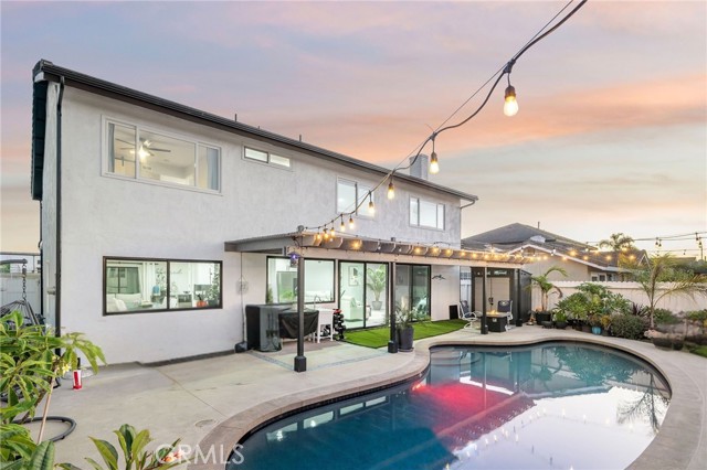 Nestled in one of Huntington Beach’s most highly sought-after neighborhoods, this beautifully renovated home perfectly blends modern luxury with everyday functionality. Step inside to find a home that feels brand-new, with every detail thoughtfully designed for style, comfort, and entertaining. The elegant entry features a spiral staircase that gracefully separates the formal and casual living spaces. To one side, a light-filled living room welcomes guests; to the other, a cozy family room with a modern gas fireplace wrapped in striking black porcelain tile — mirroring the sleek black quartz countertops and backsplash in the adjacent kitchen. The chef’s kitchen offers abundant storage and top-of-the-line appliances, including a six-burner range, smart refrigerator, microwave drawer, and a beverage fridge for effortless hosting. Dual sliding glass doors connect the indoor living areas to a private backyard retreat, where a covered patio provides shaded comfort and an inviting space to relax by the newly resurfaced saltwater pool. The pool sparkles with an abalone pebble-tec finish, and all new pool equipment. The artificial turf and updated hardscape keep maintenance to a minimum — so weekends are for lounging! One of the best features is the main-level bedroom with a full bath, offering a flexible second primary suite for multi-generational living, or guests. Upstairs, the primary suite is a true sanctuary, featuring a spa-inspired bathroom with a freestanding soaking tub, a walk-in shower, and a large closet. The fifth bedroom is currently open to the primary, making it perfect as an additional closet or office—or easily convert back to a full bedroom if desired. Recent upgrades over the past two years include new porcelain tile flooring, Milgard windows and sliding doors, a new electrical panel, tankless water heater, and fresh interior finishes throughout. The oversized two-car garage offers ample storage above and built-in shelving, plus a convenient balcony overlooking the front of the home. Just a short walk from Huntington Central Park and Lake Huntington, you’ll enjoy the very best of outdoor recreation — all while being minutes from world-famous beaches and local favorites like Pacific City, Bolsa Chica Wetlands, and the Central Park Sports Complex. From its designer finishes to its unbeatable location, this Huntington Beach gem delivers the ultimate Southern California lifestyle — where luxury meets coastal charm.