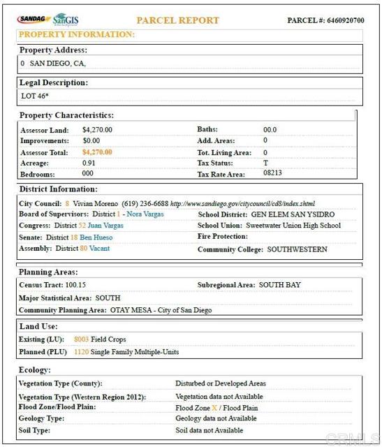 Prime Land for Sale, Incredible Opportunity! Vacant Land Parcel adjacent to Otay Mesa Central Village. Great investment in the New "Otay Central Village" Development zone. Level Lot. 39,640 S/F (.91 Acres) Lot 46 APN# 646-092-07-00. Zoned CC-3-6. This allows for "development with a high intensity, pedestrian orientation and permits a maximum density of 1 dwelling unit for each 1,000 square feet of lot area" allowing around 40 units for development, Mixed use, Commercial, etc.. Additional Permitted Uses include: Parking, Retail Sales, Groceries, Food & Beverage, bars, restaurants, offices and much more... Street access within 200' of property (see arrow in image). Seller 'may' carry note.