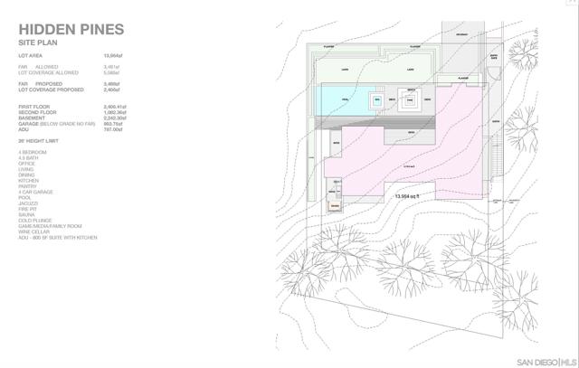 Welcome to Hidden Pines, a serene and tucked-away lot in one of Del Mar’s most coveted neighborhoods. This rare offering blends seclusion and privacy with easy access to everything that makes Del Mar and North County San Diego so desirable. The Property Set on a 13,964 sq. ft. parcel and zoned R1-10, Hidden Pines presents an exceptional opportunity to design your dream coastal retreat. Conceptual renderings (not yet approved) envision a 3,488 sq. ft. custom residence with three bedrooms and three and a half baths, spacious living and dining areas, a gourmet kitchen with pantry/cellar, and a seamless flow to outdoor spaces designed for entertaining. Additional features include a below-grade 994 sq. ft. four-car garage and a 797 sq. ft. ADU suite with a full kitchen — ideal for guests, extended family, or a private office. Planned resort-style amenities include a pool, jacuzzi, fire pit, sauna, and cold plunge, creating a true wellness retreat at home. Seller Credit To bring your vision closer to reality, the seller is offering a construction credit of $800 per square foot for all built space — including the main home, garage, and ADU. With a total of 5,279 sq. ft. proposed, this equates to a credit of approximately $4.2 million. This extraordinary contribution allows you to focus on creating the finishes, details, and personal touches that will make this home distinctly yours. The Lifestyle Perched to capture sweeping Pacific Ocean views, Hidden Pines offers the perfect canvas to embrace Del Mar’s coastal lifestyle. Step outside your door and onto the...See supplement The Lifestyle Perched to capture sweeping Pacific Ocean views, Hidden Pines offers the perfect canvas to embrace Del Mar’s coastal lifestyle. Step outside your door and onto the trails of the Torrey Pines Reserve Extension. Within minutes, stroll the world-famous beaches of Del Mar, explore the dramatic beauty of Torrey Pines State Reserve, or experience the excitement of the iconic Del Mar Racetrack. Quick access to I-5 and the Solana Beach Train Station ensures effortless commuting or weekend escapes to San Diego, Orange County, or Los Angeles. Your Opportunity This is a rare chance to secure a piece of Del Mar’s coastal charm — an inspiring canvas for the home you’ve always imagined, supported by an unparalleled construction credit to make it possible.