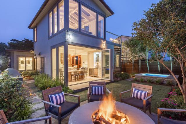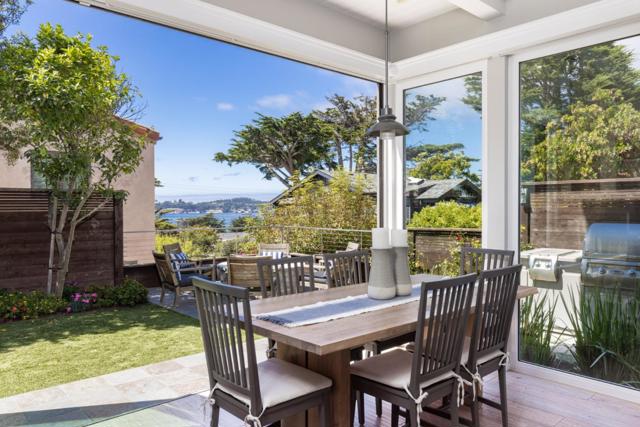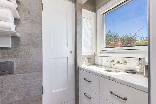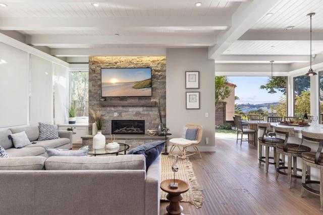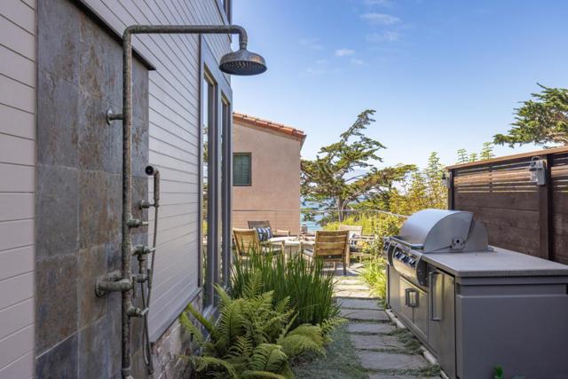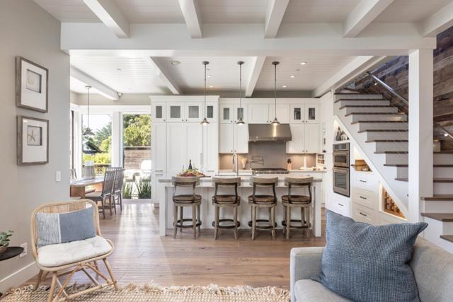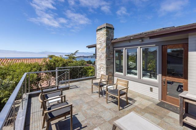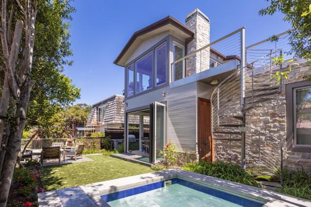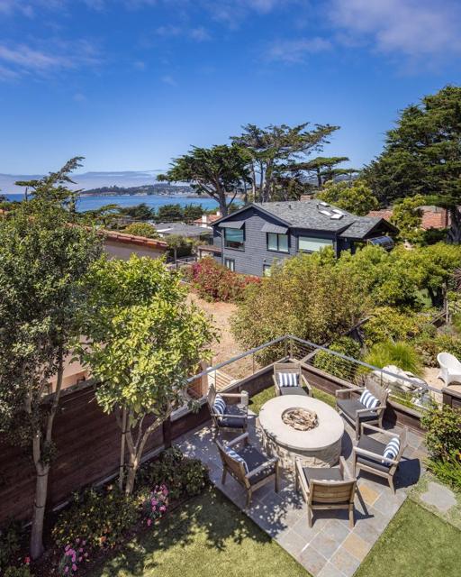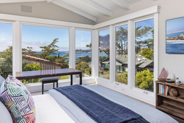 Located in Carmel-by-the-Sea's coveted Golden Rectangle, this refined coastal retreat blends timeless design with modern luxury. Remodeled in 2014, every element of the home reflects thoughtful craftsmanship and elevated beachside living. Expansive sliding doors dissolve the boundary between indoors and out, leading to multiple outdoor living spaces designed for both relaxation and entertaining. The main level hosts two bedrooms, including the serene primary suite, both with a Scandinavian-inspired fireplace. The primarys spa-like bathroom features a freestanding soaking tub with tranquil garden views and ocean peeks. Upstairs, a sunlit guest suite is surrounded by windows that capture sweeping vistas and opens directly onto the rooftop deck. Ideal as a beach getaway or full-time retreat, this home captures the essence of Carmel living.