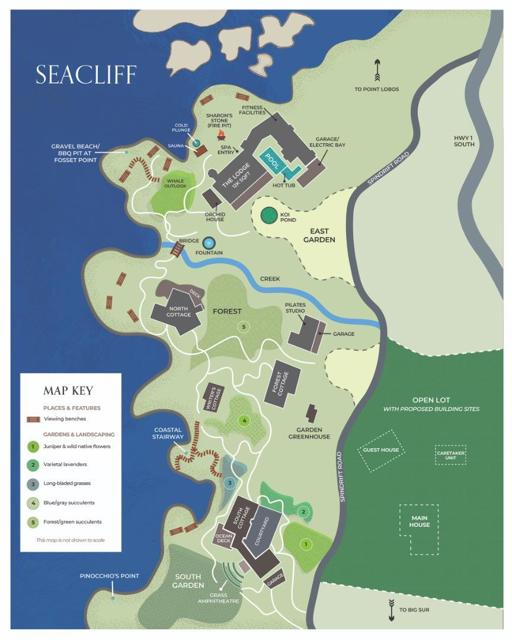 Situated in an ancient Cypress forest and perched on the granite coastal cliffs of the Central Coast, Seacliff is a once-in-a-lifetime aggregation of five contiguous lots on famed Spindrift Road in the Carmel Highlands. Stretching over ~5.35 acres with almost 1,000 feet of private oceanfront coastline, this completely unique compound offers a variety of rare and rugged ocean vistas and private outdoor living spaces. The grand Lodge is an 8 bedroom, 12,441 sq ft mansion, featuring an unforgettable library with gold-leaf domed ceiling. The two fully-appointed cottages both have stunning living rooms and bespoke kitchens, and two more guest cottages offer a unique and cozy one-bedroom, luxury cabin experience. The center courtyard of the Lodge features a waterfall pool and hot tub leading into the gym. Meandering paths weave through the breathtaking oceanside gardens, numerous meditation areas, and three coastal access stairways that bring you down to the Pacific's edge. 150,000 pounds of mossy boulders, large floating flagstone steps, and multiple seaward viewing posts, anchored by the cottages 6 enormous, rustic fireplaces, give the property its primary bohemian insignia and making Seacliff one of the most dramatic oceanfront properties in the world.