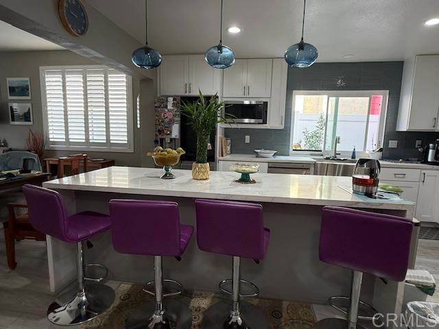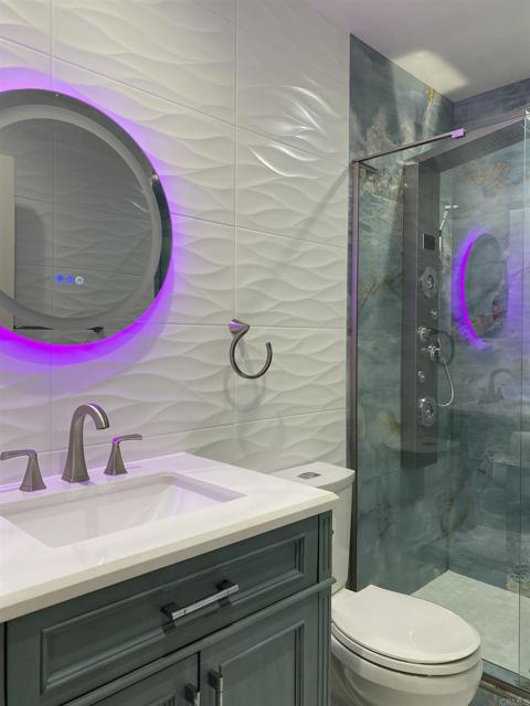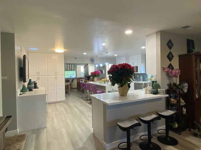 BEAUTIFULLY REMODELED HOME WITH ROOM ADDITION. Westside of Mira Mesa on a cul-de-sac street, close to a park, an elementary school and numerous shopping/restaurant opportunities. 2 remodeled bathrooms with floor to ceiling tiling, master bathroom comes with bluetooth controlled lighting and speaker, newer flooring, newer interior and exterior painting, enlarged & remodeled kitchen with waterfall island, glass tiled backsplash, and pantry. Permitted room addition with sliding door electric window treatment and shutters, and Hubspace controlled ceiling lighting. Backyard complete with fruit trees, vegetable garden opportunities, basalt rock water fountain, and two storage sheds. Front and rear yards complete with drip irrigation system and controller.