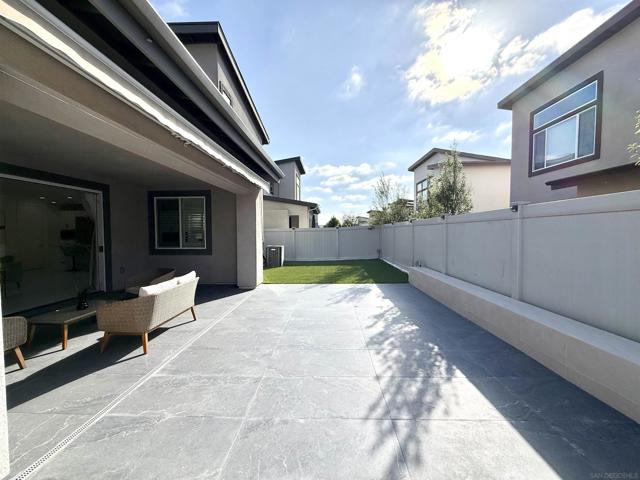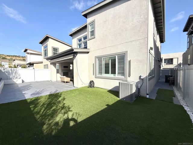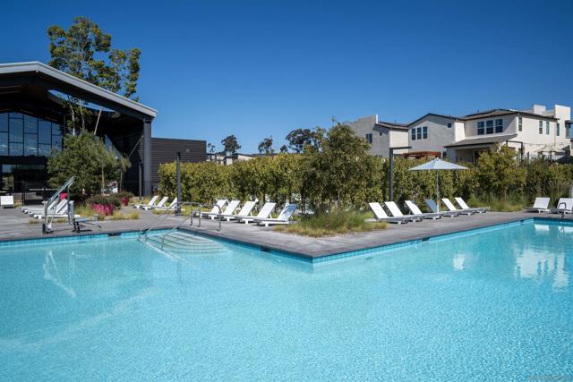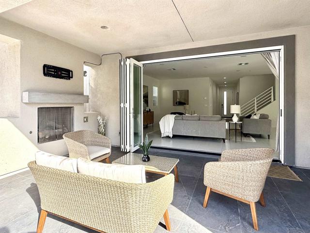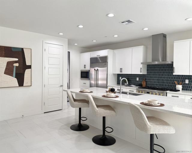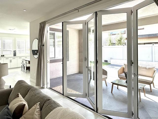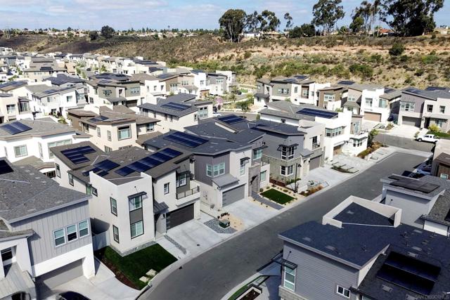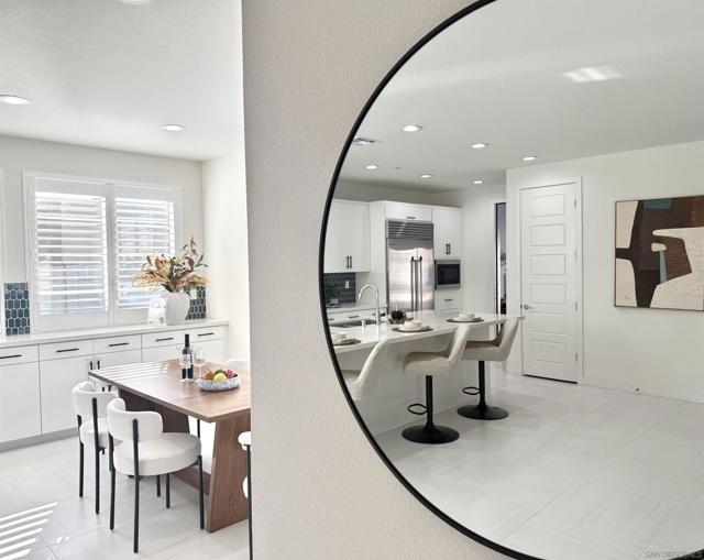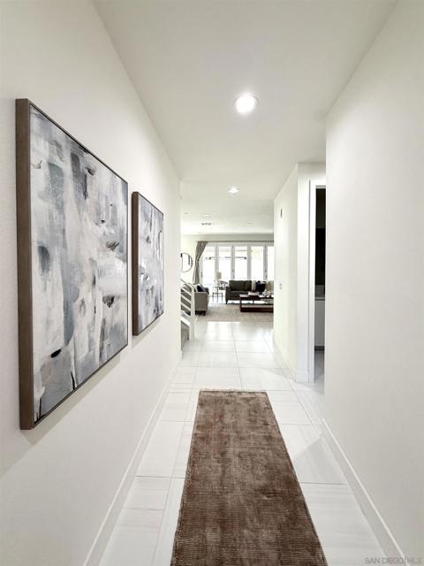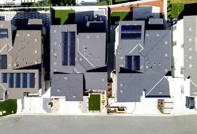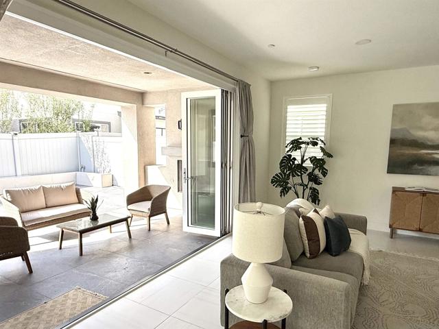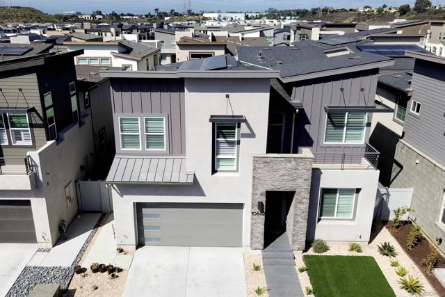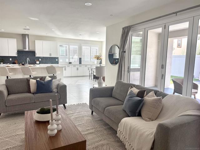 Welcome to the highly sought-after 3Roots master-planned community in Sorrento Mesa. The open-concept main living areas are filled with natural light and finished with oversized, contemporary tile flooring, creating a clean, seamless look throughout the living room, kitchen, dining area, and bathrooms. The chef’s kitchen features quartz countertops, an expansive island, upgraded backsplash, GE Monogram Wi-Fi enabled appliances, 6-burner gas range, Sub-Zero refrigerator, smart faucet, and a spacious walk-in pantry. The living room opens through collapsible glass doors to an upgraded California Room with fireplace, finished with premium, slip-resistant tile flooring that extends into the beautifully designed backyard. The backyard offers a resort-style setting with coordinated large-format tile, built-in concrete bench with designer tile accents, antimicrobial turf, solar-powered fence lighting, multicolor LED accent lighting, outdoor water access, and power for an outdoor television—ideal for year-round entertaining. The front entry is enhanced with elegant large-format tilework, complemented by professionally installed live landscaping and a Wi-Fi controlled irrigation system, creating a polished and low-maintenance arrival experience. The primary suite features a spa-inspired bathroom with upgraded tile finishes and a custom walk-in closet. Additional highlights include a loft with balcony, window shutters throughout, smart lighting and thermostats, HEPA air filtration, whole-home water filtration, EV-ready garage, and a fully paid solar system. Residents enjoy access to resort-style pools, fitness center, clubhouse, parks, and miles of scenic trails. Centrally located near shopping, dining, beaches, and major tech and biotech employers.