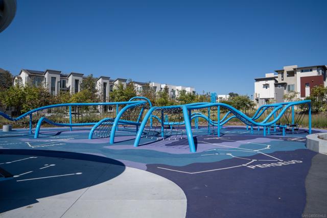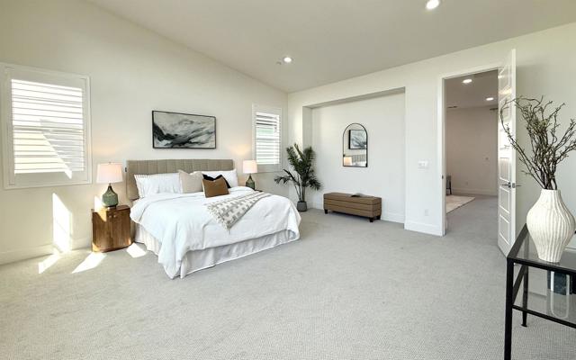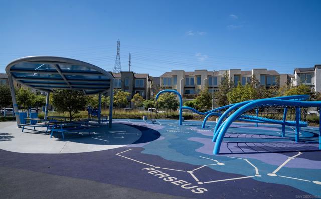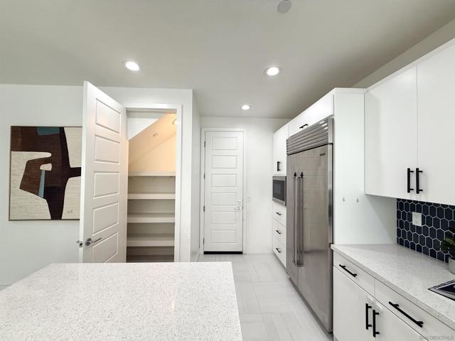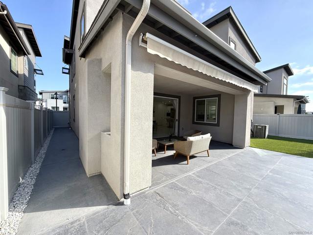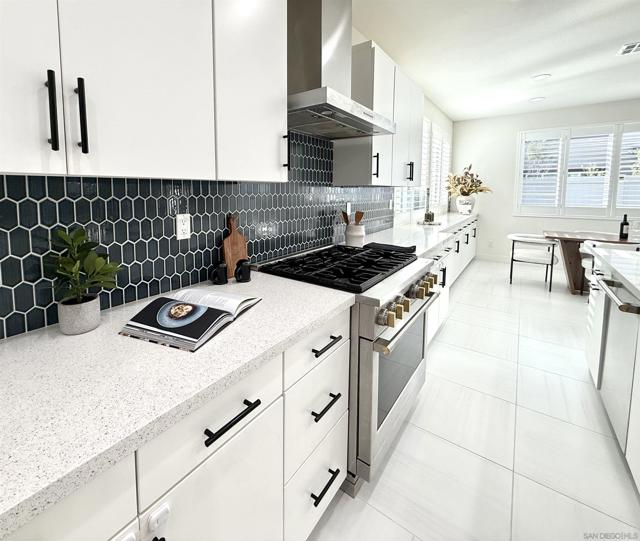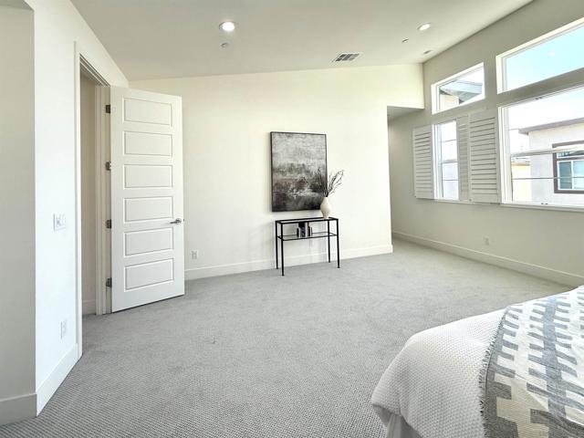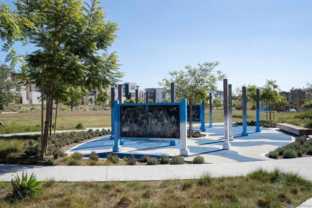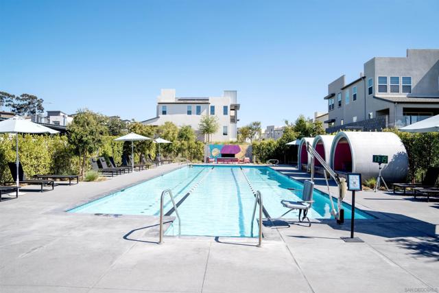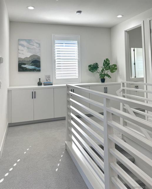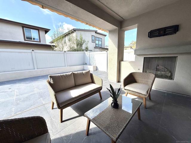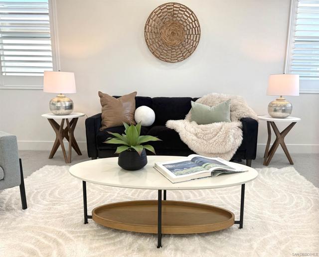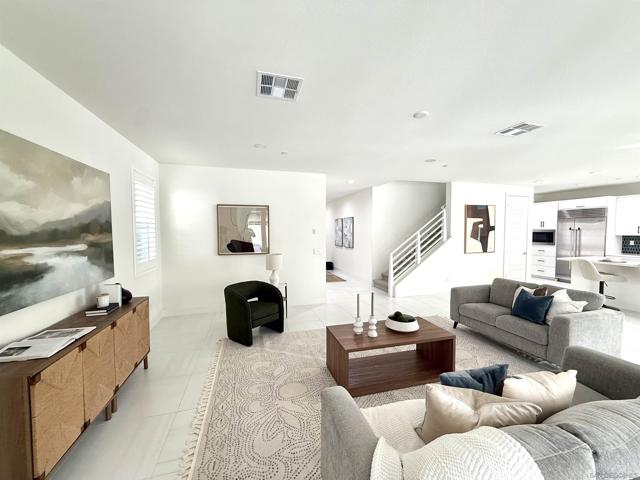 Welcome to the highly sought-after 3Roots master-planned community in Sorrento Mesa. The open-concept main living areas are filled with natural light and finished with oversized, contemporary tile flooring, creating a clean, seamless look throughout the living room, kitchen, dining area, and bathrooms. The chef’s kitchen features quartz countertops, an expansive island, upgraded backsplash, GE Monogram Wi-Fi enabled appliances, 6-burner gas range, Sub-Zero refrigerator, smart faucet, and a spacious walk-in pantry. The living room opens through collapsible glass doors to an upgraded California Room with fireplace, finished with premium, slip-resistant tile flooring that extends into the beautifully designed backyard. The backyard offers a resort-style setting with coordinated large-format tile, built-in concrete bench with designer tile accents, antimicrobial turf, solar-powered fence lighting, multicolor LED accent lighting, outdoor water access, and power for an outdoor television—ideal for year-round entertaining. The front entry is enhanced with elegant large-format tilework, complemented by professionally installed live landscaping and a Wi-Fi controlled irrigation system, creating a polished and low-maintenance arrival experience. The primary suite features a spa-inspired bathroom with upgraded tile finishes and a custom walk-in closet. Additional highlights include a loft with balcony, window shutters throughout, smart lighting and thermostats, HEPA air filtration, whole-home water filtration, EV-ready garage, and a fully paid solar system. Residents enjoy access to resort-style pools, fitness center, clubhouse, parks, and miles of scenic trails. Centrally located near shopping, dining, beaches, and major tech and biotech employers.