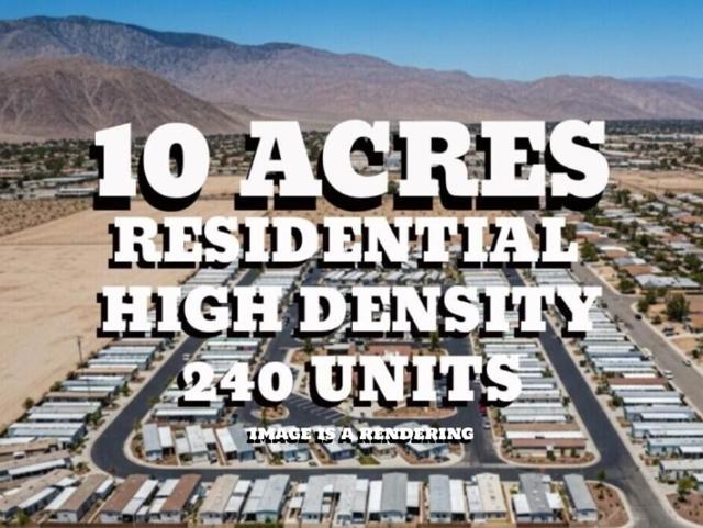 Owner may carry 35% down. High density residential 10 acres. City may allow for condos, large apartment buildings, or a mobile home park. Zoned Residential High Density (R-HD) 24 units per acre. The planning department may allow for 240 mobile homes or condos/apartments. There may be opportunities for more units under special low income housing programs. Property appears to have power, water, communications lines, pavement at the corner, & road access at either end of the lot. City is on septic and property may need a self-contained sewage septic system. Close to the Marine Base with about 12,500 active duty, 24,000 family members, & another 21,000 DOD employees & contractors. The nearby Joshua Tree National Monument sees about 3 million tourists annually. 29 Palms is experiencing a renaissance of new construction, businesses, restaurants, retail & cafes. The new Freedom Plaza Mall of 2022. In recent years we've seen new attractions such as the Tortoise Rock Casino & the 29 Palms Motorsports Complex. More celebrities, artists, & musicians are calling 29 Palms home than ever before. For a long time the area has been popular for retirees & snow birds. This is a great opportunity for an investment company to build & cash flow. Possibly the ideal property for low income housing grants. So many opportunities to optimize this property. Buyers must contact the city planners for all questions on building & uses. Buyers must contact the utilities agencies for all questions on utilities. APN: 0623-131-09 GPS 34.143854, -116.048511 Address is not an assigned address & is for marketing purposes only.