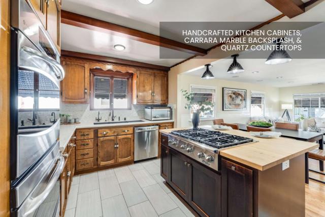 Beautifully remodeled Craftsman home in Santa Clara's sought-after Old Quad neighborhood - 3 bedrooms and 1 bath on the main level with a fully finished basement for 2,374 sq ft living space on a 5,040 sq ft lot. Original oak hardwood floors, wainscoting, and preserved trim set the tone upstairs. The kitchen features handcrafted cabinetry, Carrara marble backsplash, quartz countertops, a butcher block island with 6-burner Dacor cooktop, and premium GE Café/Profile appliances. The finished basement adds a 4th bedroom, secondary living area, wine room with wet bar, and a private office - with built in audio perfect for entertaining. The bathroom includes a Carrara marble double-sink vanity, tub, and separate shower. Outside: fully fenced yard, covered patio, detached 2-car garage with workshop, and a long driveway for extra parking. Minutes from Nvidia, Apple, Highways 101/280/87/880, Valley Fair Mall, and walking distance to the Santa Clara Farmers' Market, Target, and Sprouts.
