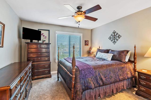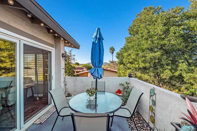Beautiful turn-key, single story, 2 br, 2 ba end unit in "Alameda" complex. Private patio off living room with sunset views! Renovated throughout with wood-like porcelain flooring in all areas except for carpets in brs. Recessed lighting in kit, entry, hallway, & bathrms. Newer water heater, HVAC system & ducting.Ceiling fans in LR & both brs. Upgraded kit cabinets & granite counters. Stainless steel appliances, double oven, refrigerator, dishwasher. Stackable washer/dryer in kit closet. Quartz bathrm countertops, custom mirrored wardrobe doors in brs. Custom drapery & rod in LR. Most hardware upgraded, including front door. Assigned one covered parking space with storage. Located in desirable Poway School system. Move-in ready and much more to see and appreciate!