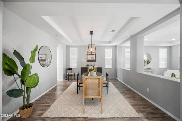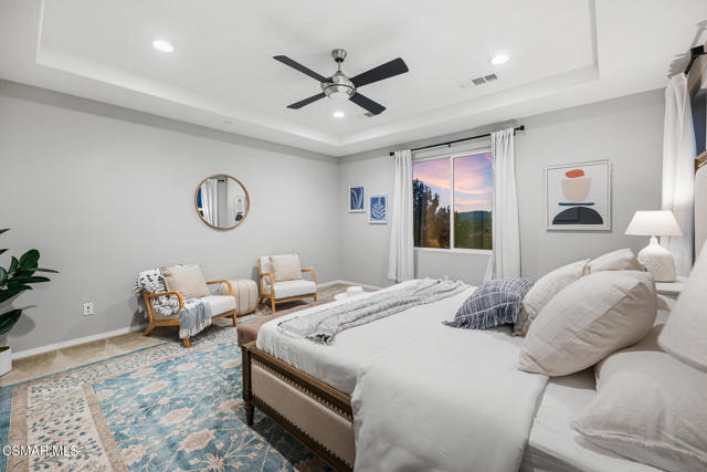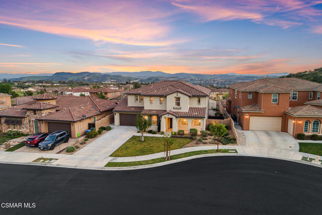 An exceptional opportunity within the gated Meridians of Moorpark. Built in 2017, this impressive cul-de-sac residence offers five bedrooms, five bathrooms, and over 3,800 square feet of open, thoughtfully designed living space. The home feels expansive yet inviting, with wood-like flooring, recessed lighting throughout, and generously sized rooms that flow effortlessly from one to the next.The designer kitchen serves as the heart of the home, showcasing a large center island with breakfast bar and pendant lighting, custom tile accents, quartz countertops, bright white cabinetry, and stainless steel appliances. A pot filler at the range adds both convenience and style, while the casual dining area creates an ideal setting for everyday living or intimate gatherings.A grand staircase leads upstairs to a versatile loft and well-appointed bedrooms, many enjoying scenic views of the surrounding hills. The primary suite offers a peaceful retreat, complete with dual sinks, tile flooring, a separate shower, and a sunken soaking tub designed for true relaxation.The backyard is designed for effortless entertaining and quiet moments alike, featuring a spacious paver patio, built-in fire pit with bench seating, custom decking, and a covered patio, all set against sweeping panoramic mountain and hillside views. Located within a secure gated community, this newer home combines space, comfort, and elevated design--creating a setting that feels as impressive as it is easy to enjoy.