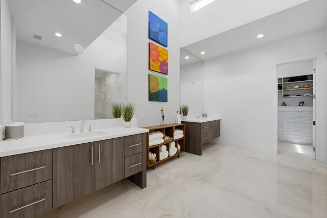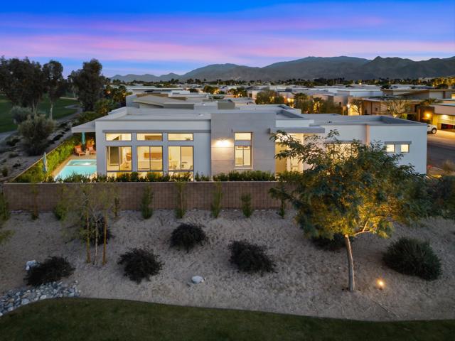 This stunning, elegant modern home with panoramic mountain views is in the gated community of Escena. Built in 2020, the 2,561 sq. ft. residence offers luxurious living space on a corner lot situated on the 2nd fairway of the esteemed Escena golf course in Palm Springs. Featuring 3 bedrooms and 3 bathrooms, this highly upgraded home showcases an open-concept design with dramatic 12-foot ceilings and expansive living spaces filled with natural light. Elegant La Faenza Italian porcelain tile flooring flows throughout, creating a sleek, modern aesthetic. The chef's kitchen showcases premium KitchenAid commercial-grade stainless steel appliances, an oversized center island, quartz countertops, marble tile backsplash, upgraded fixtures and under-cabinet lighting. The heart of the home opens beautifully to the outdoors with a retractable wall of La Cantina bifold stacking doors creating a seamless transition to the patio and pool area - perfect for true indoor-outdoor living. The primary suite features a spa-inspired bath with an expansive walk-in rain shower, custom Carrara marble tile walls and heated floors. The suite is completed with dual vanities, a large walk-in closet designed by California Closets and automated blackout blinds. A second guest bedroom offers privacy and comfort with its own ensuite bath, dual vanity, custom shower, and blackout blinds. The third bedroom is versatile - ideal as an office or guest space - highlighted by a custom 9-foot solid double door entry. Step outside to your private resort-style backyard complete with a pool and spillover spa, enhanced by a Pentair pool and spa automation system for effortless control, a generous 720 sq ft of pet-friendly artificial turf, providing low-maintenance beauty and play space. Both the front and back yards have been newly landscaped, and the front door & custom front gate includes an internet-enabled lock for modern security and convenience. Additional features include Control 4 home automation system, water filtration & softening system, separate laundry room with built-in cabinetry and utility sink, and a 2-car garage with an insulated door & level 2 EV car charger. Set directly on the golf course within one of Palm Springs' most desirable gated communities, this home delivers contemporary elegance, smart technology, and true resort-style living.