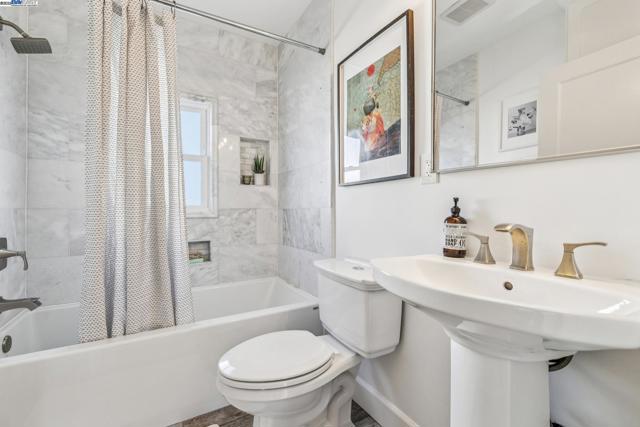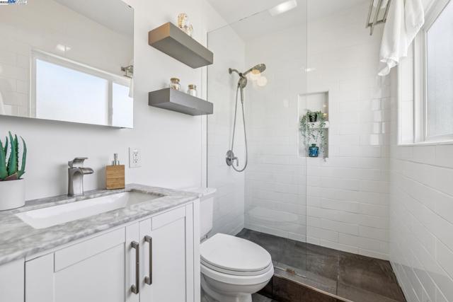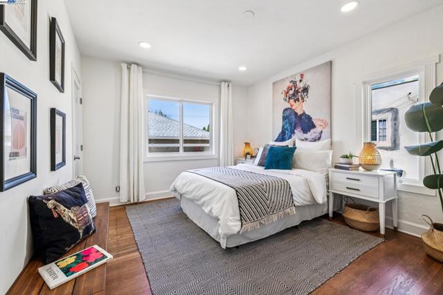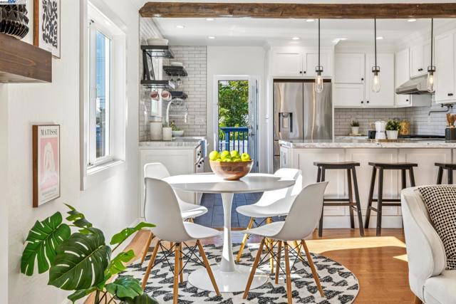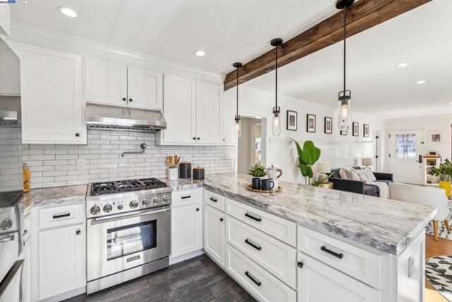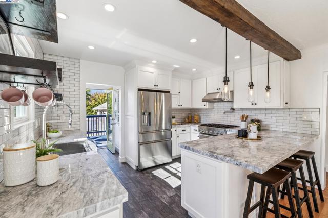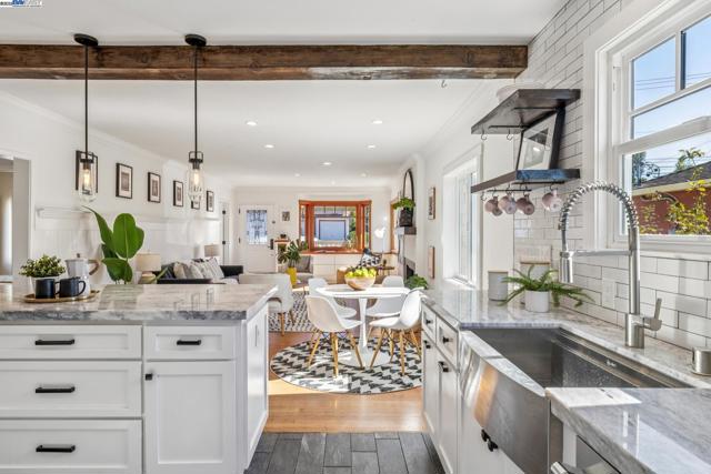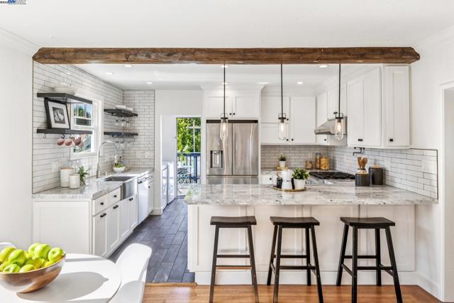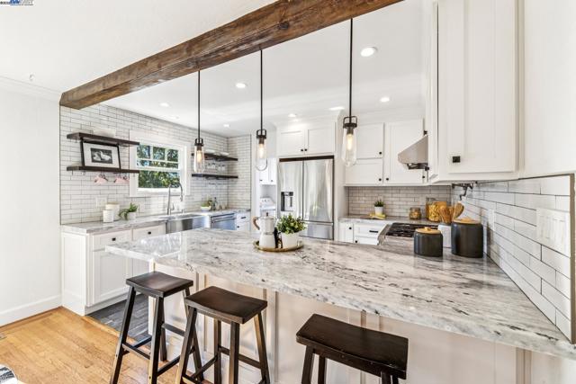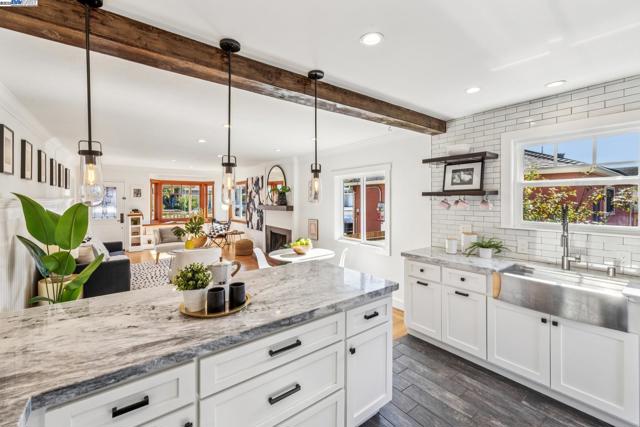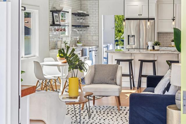Enjoy the ease and comfort of a beautifully renovated home in this 3BD/2BA Craftsman bungalow in convenient El Cerrito. With great outdoor spaces, the 1114 SQFT home lives large. A welcoming new porch and deck greet you as you step inside the expansive open floor plan with wonderful flow. The living room enjoys a picture bay window, built-in bookshelves, and a cozy fireplace. Family and friends can relax in the living and dining areas or gather at the breakfast bar, while you enjoy a spacious chef’s kitchen with top of the line appliances, chic tiling, and a pot filler. Through a laundry area, a glass door opens onto a deck for easy indoor/outdoor living in the fabulous backyard. With a large patio, maintenance free turf, lovely garden, apple tree, and plenty of room to entertain, play, and unwind. Back inside, gorgeous hardwood floors and recessed lighting span the home. The primary suite features a custom closet and stylish new bath, while the second bedroom is sunny with a hallway bath. A bright front third bedroom with a closet could also be a great office, playroom or nursery. There’s a generous 2-car garage with storage and driveway for more parking, and BART nearby. Down the road, enjoy parks, trails, a public pool and courts, plus shopping and restaurants.