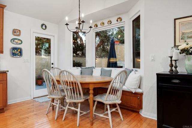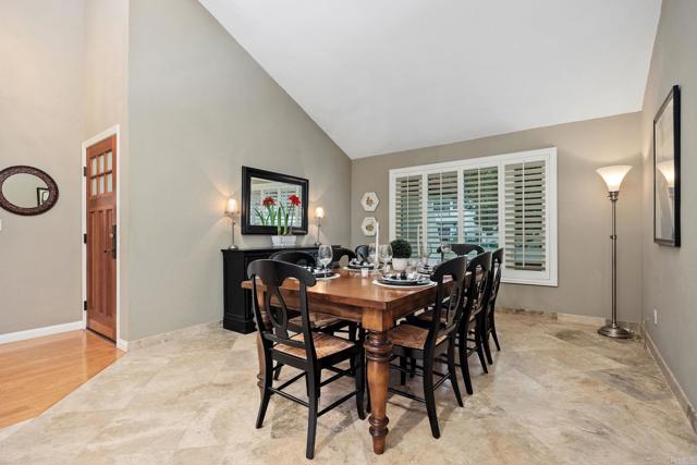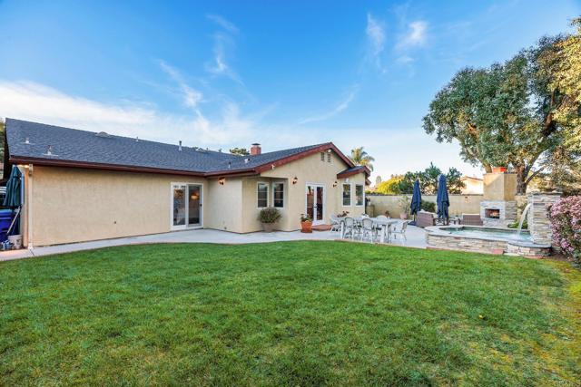 Perched on an elevated lot in Del Mar, this single-story home offers exceptional privacy while remaining close to the best of coastal living. Mature trees, a wide driveway, and manicured grounds create timeless curb appeal, while sculpted greenery and an arched entry lead along a garden lined approach to a rich wood front door that sets a warm and welcoming tone. Step inside to a defined entry that flows into formal sitting and dining rooms, where vaulted ceilings elevate the space and Plantation shutters softly filter natural light. The kitchen anchors the main living space with a large center island offering storage and seating for three. Rich wood cabinetry pairs beautifully with green granite countertops and a tumbled marble backsplash with decorative inlay. Stainless steel appliances include a built-in KitchenAid refrigerator, GE Cafe dual-oven with French doors, Dacor range with Viking hood, Kenmore dishwasher, and a commercial grade stainless sink. A pantry wall and integrated desk create a functional pass through to the formal dining room. Beyond the kitchen island, a bay window breakfast nook with built in banquette seating overlooking the private backyard. The kitchen flows seamlessly into the family room with matching wood cabinetry, while French doors and a secondary kitchen door create effortless indoor-outdoor living. Down a private hallway, the bedroom wing offers a quiet retreat. The primary suite opens to the backyard and features two wall closets and an en-suite bath with a vanity area and step in shower with a built-in bench. Three secondary bedrooms share two baths, and an interior laundry room connects directly to the garage for everyday convenience. The three-car garage features high ceilings and ample storage, with parking for two vehicles and a third bay converted into a bonus space. Complete with its own window and connected to the home’s heating system, the flexible area is well suited for a den, office, or fitness room. Designed for entertaining and everyday enjoyment, the backyard lives like a private retreat. The spacious patio is anchored by a raised outdoor fireplace and built-in gas barbecue, providing convenient & relaxing gathering spaces. A spa with cascading waterfall serves as a tranquil focal point, while generous hardscape offers room for dining and lounging. Beyond, a grassy lawn, expansive side yard, mature trees, and brick accented walls provide exceptional privacy and space rarely found in Del Mar.