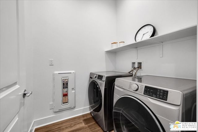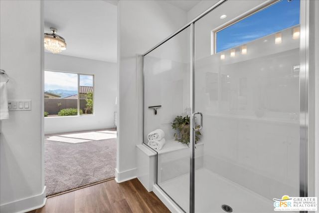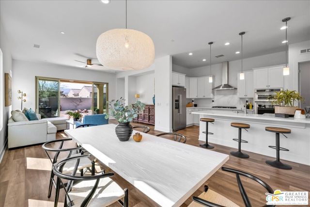 Light-Filled Phase 4 Getaway with Expansive Yard & Mountain Views! Welcome to this beautifully appointed Phase 4, Plan 1 Getaway floorplan, offering an exceptional blend of comfort, style, and mountain views. With a spacious POOL SIZED YARD and stunning mountain backdrop, this light and bright residence is thoughtfully designed for relaxed resort-style living. Inside, a fresh white palette creates a clean, modern aesthetic, complemented by upgraded 5-inch baseboards, luxury PLANK VINYL flooring, and BRAND-NEW CARPET throughout. The home feels crisp, inviting, and move-in ready. The kitchen has been tastefully upgraded and serves as the heart of the home, featuring 42-inch upper cabinetry, QUARTZ COUNTERTOPS, and a KitchenAid Professional Series appliance package. A generous island peninsula with an apron-front sink, additional pendant lighting, and ample seating makes it perfect for entertaining or casual dining. The kitchen flows seamlessly into the GREAT ROOM, where living and dining spaces come together in an open, light-filled setting with contemporary finishes and beautiful sightlines to the outdoors. The primary suite offers brand-new carpeting and tranquil views of the yard and surrounding mountains. The ensuite bath is both elegant and functional, featuring dual vanities, a spacious stall shower with bench seating, and generous closet space. Privately positioned on the opposite side of the home, the guest bedroom provides comfort and separation for visitors, with convenient access to a full secondary bath. Additional highlights include a dedicated laundry room with Samsung washer and dryer, Cat6 internet connections in the living room, primary suite, and guest bedroom, and leased SOLAR ($90.56 Mo) for enhanced energy efficiency. Located within the prestigious 55+ Del Webb Rancho Mirage community, residents enjoy access to a spectacular clubhouse, state-of-the-art fitness center, resort-style pool and spa, tennis and pickleball courts, and a vibrant calendar of social activities. Beautifully maintained, thoughtfully upgraded, and ideally positioned to capture mountain views - this is desert living at its finest. Note: Calbe and Internet package nwo included in HOA Fee!