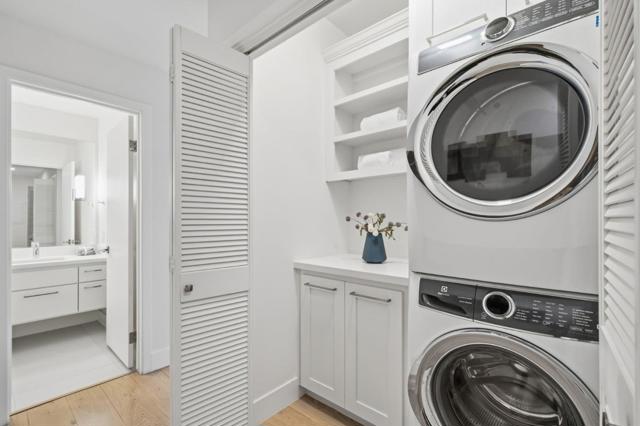 Gorgeous, contemporary, single-level condominium renovated in 2019. Located on a quiet, tree-lined street but only steps away from vibrant downtown Menlo Park. This end-unit condo with a wall of windows facing southwest and two balconies is special -- come see it at the open house on Sunday morning, then stroll a couple of blocks to the downtown Farmers' Market for some fresh treats, flowers, and music! This sun-drenched, spacious unit features expansive living and dining rooms, high ceilings, wide-plank European hardwood floors, double-paned Andersen windows and doors, and recessed and custom lighting. The beautiful and functional chef-style kitchen with stainless steel appliances, quality cabinetry, and quartz countertops makes entertaining easy and enjoyable. Additional features that add to the comfort and convenience of the home include 2 inviting balconies, central air conditioning, in-unit washer and dryer, and ample storage space. The secure building features 2 locked pedestrian gates and a secure underground garage with 2 assigned parking places and a private storage locker. With a wave of high-profile restaurants opening downtown recently (see tinyurl.com/menlo-park-wave), Menlo Park is the hot destination on the Peninsula -- come experience the lifestyle for yourself!