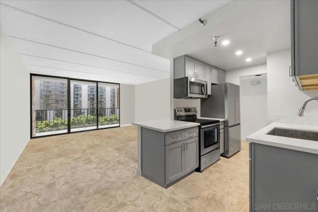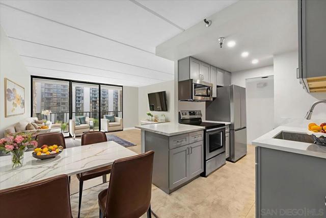 Experience upscale urban living in this stylish one-bedroom condo at Symphony Terrace, perfectly located in the heart of Cortez Hill. Perched on the 4th floor, this home features floor-to-ceiling windows and a private balcony showcasing beautiful east-facing city views. Inside, the open-concept layout offers elegant tile flooring, a dining area, and abundant natural light throughout. The completely renovated kitchen is equipped with recently updated stainless steel appliances—perfect for anyone who enjoys cooking at home. The bathroom has been meticulously remodeled with modern touches. Symphony Terrace is currently updating the building with impressive upgrades, including a renovated fitness center, refreshed outdoor patio spaces, and updated flooring in the building’s common areas, elevating the community’s overall look and feel. Additional highlights include an in-unit LG front-loading washer and dryer, plus a secured parking space with extra storage.