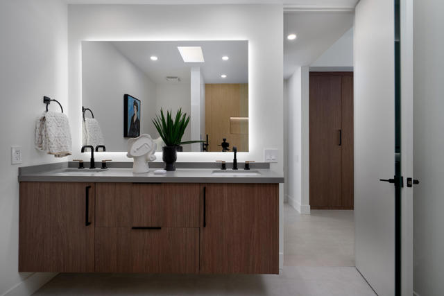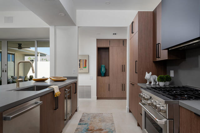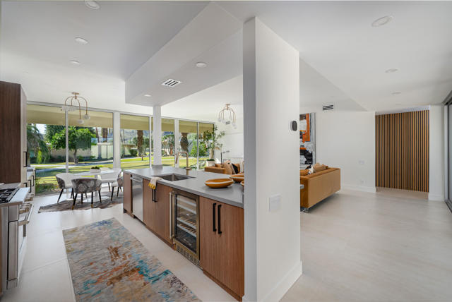 Your modernist dream home awaits in this gorgeously remodeled, 2bed/2bath, at the coveted Seven Lakes Country Club! Originally designed by Richard A. Harrison, inside its shadow-blocked walls, this spacious unit is freshly redesigned for today's living. Spread out over the 1,545 sq ft open floor plan, highlighted by large format tile floors, and get ready to entertain in style! The new kitchen is finished with custom Italian cabinetry, and high end appliances including a commercial grade, paneled Fisher & Paykel refrigerator, a wine fridge, plus a large breakfast bar. Walls of glass sliders open out onto a green leisure terrace with views of the mountains and the iconic Southridge estates. Enclosed for maximum privacy, the northern window wall opens onto a large private courtyard, sited to include wraparound mountain views and lined with a desertscaped perimeter garden. Both spacious bedrooms offer sleek custom closets, as well as walk in rain showers in both beautiful baths. The tranquil pool is just steps away. Past the 24-hour guarded gate, 'The Gem of the Desert' offers a unique elevated lifestyle with its Ted Robinson-designed 18-hole executive golf course, 15 pools and spas with poolhouses, and the lively William Cody designed clubhouse waiting to welcome you to its formal dining room, casual cocktail lounge, and a terrace overlooking the waterfall-fountain. Welcome home!