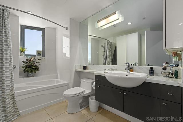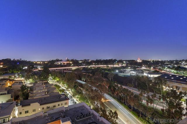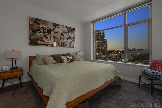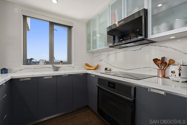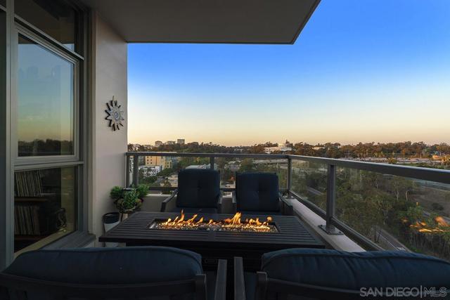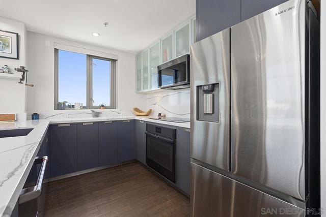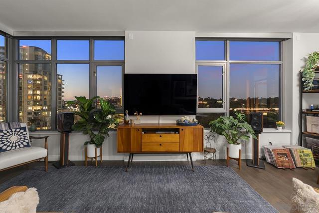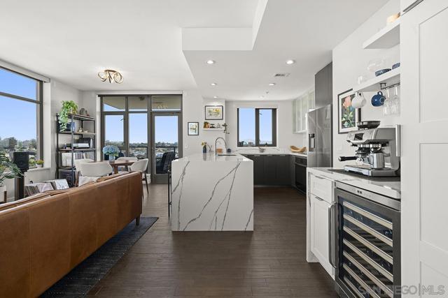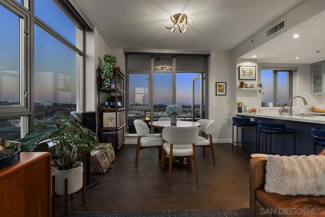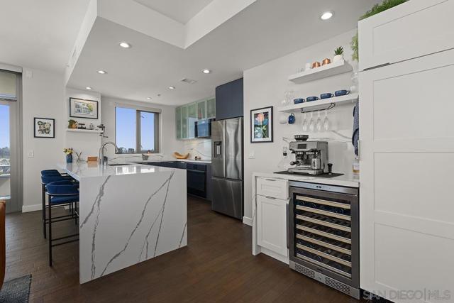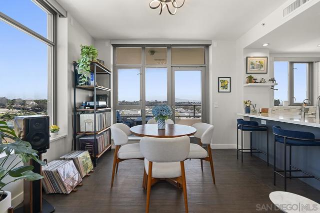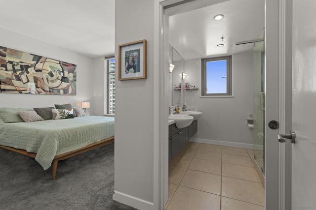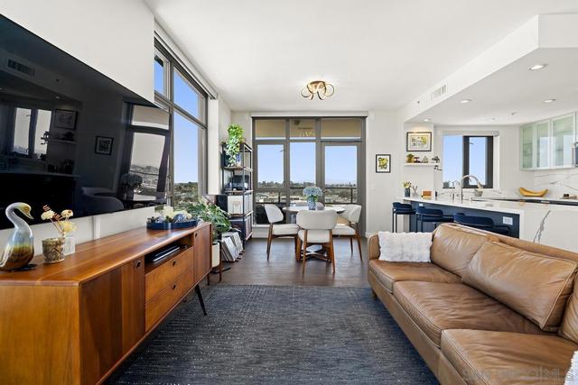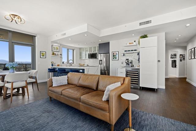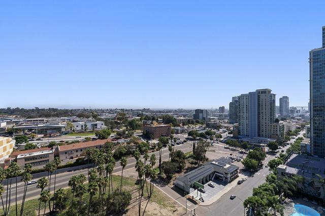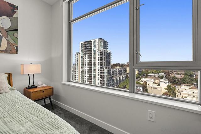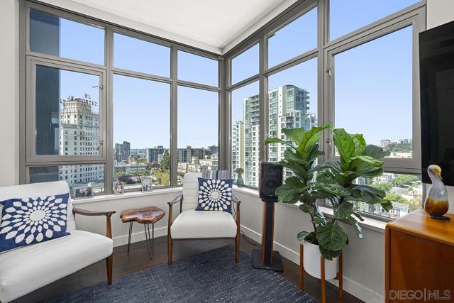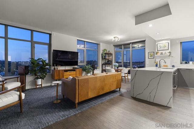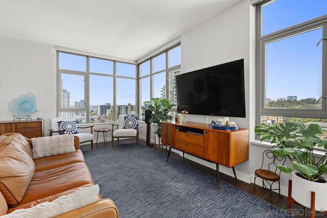 Perched on the 14th floor, this "Pride of Ownership" northeast corner residence at Aria impresses with sweeping 270° views of the city skyline, Balboa Park, distant mountains, and even glimpses of the Bay and Coronado Bridge. Enjoy the vibrant Downtown energy from your spacious private balcony—perfect for morning coffee or soaking in peaceful sunrises. Inside, the open living area dazzles with sleek ceramic wood-look tile flooring, floor-to-ceiling windows, motorized shades, and airy 9-foot ceilings that create a seamless blend of comfort and sophistication. The chef-inspired kitchen is a true showpiece, featuring Calacatta quartz countertops with waterfall edge and backsplash, an extended eat-at bar, Bosch induction cooktop, convection oven with air fryer, dual-drawer dishwasher, instant hot water faucet, and Gallery microwave. A custom-built coffee bar and beverage chiller elevate everyday convenience with a touch of luxury. The primary suite includes blackout shades and a beautifully upgraded ensuite bath with a glass shower enclosure and dual vanity, while the guest bathroom features a custom-built linen cabinet for added storage. Additional highlights include tandem parking and a private storage room conveniently located directly in front of the parking spaces. Set within the sought-after Cortez Hill neighborhood, Aria offers a serene residential feel just moments from Downtown’s finest dining, culture, and entertainment—modern luxury perfectly balanced with urban excitement. Located atop Cortez Hill, the highest point in San Diego, Aria was completed in 2008 and comprises 137 units. This prime location is set away from the city's hustle and bustle, offering both tranquility and convenience. Residents can enjoy a short stroll to Little Italy, Gaslamp Quarter, Balboa Park and the vibrant offerings of Downtown San Diego, coupled with excellent freeway access for broader travels. Aria residences boast spacious outdoor balconies and terraces, enhancing the living experience with modern comforts and views of the bay, Balboa Park, and the city skyline. The building's amenities include a fitness center, lap pool and spa, club room with a catering kitchen and wet bar, all designed to elevate the quality of life for its residents so Welcome Home!