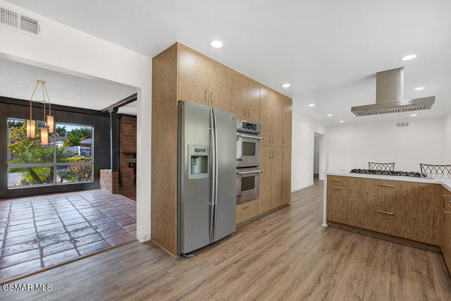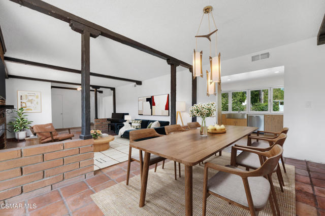 Welcome to 1558 Norwich Ave.! - a stunning 5-bedroom, 2-bathroom, 2,065 sq ft mid-century modern style home located in the highly sought-after Shadow Oaks neighborhood of Thousand Oaks. This gem boasts charming curb appeal, a classic double-door entry and beautifully blends timeless design with modern updates. Step inside to find Spanish tile flooring, exposed beam ceilings, stylish light fixtures, bold accents and floor-to-ceiling windows that bathe the home in natural light. The inviting living room features a large brick fireplace--perfect for cozy evenings. Enjoy the spacious kitchen offering quartz countertops, stainless steel appliances, a farmhouse sink, breakfast bar, recessed lighting and unique folding kitchen windows that create a seamless indoor-outdoor flow--ideal for entertaining with a convenient pass-through to the backyard. The primary suite is a private retreat showcasing an updated ensuite bathroom. Four additional bedrooms (one with a large glass slider leading to the backyard), a beautifully upgraded guest bath, laundry room with ample storage and a direct-access 2-car garage complete the thoughtfully designed interior. Outside, relax in your very own backyard oasis with a sparkling pool, sun deck, garden with lemon & peach trees, a detached air-conditioned workspace/art studio (with a window) as well as plenty of space to unwind. Centrally located near shopping, dining, award-winning schools, parks, hiking trails and more - welcome home! *Additional amenities include - freshly painted interior/exterior, solar, newer HVAC/ducting & plumbing.