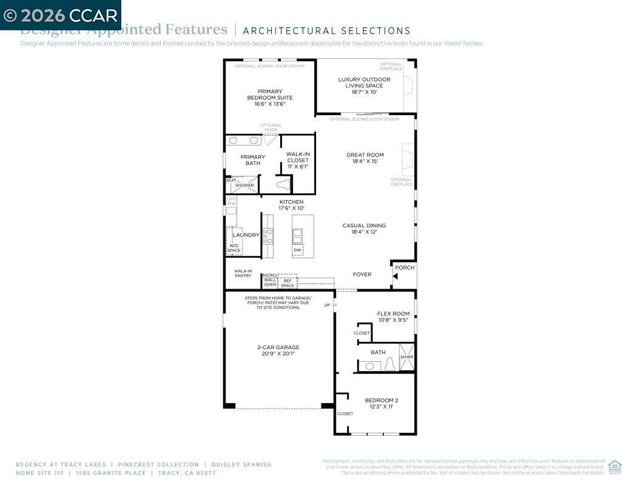 Welcome to Regency at Tracy Lakes, 55+ Active Adult Gated Community luxury living. With three picturesque lakes, this community offers a fishing dock, 1-acre garden and dog park. With a wealth of amenities, including a clubhouse, indoor and outdoor pools, cabanas, a yoga studio, fitness center, bocce ball, and pickleball courts, every day here is an opportunity for relaxation and recreation. Onsite lifestyle director ensures there’s always something to look forward to; from fitness classes to comedy shows and wine nights. A cozy foyer and generous flex room are open to the spacious great room, central to the bright casual dining area and desirable luxury outdoor living space. The kitchen is highlighted by a large center island, stainless steel appliances, 36" gas cooktop, and a roomy walk-in pantry. Primary bedroom suite has a sizable walk-in closet, and a lovely primary bath with dual-sink vanity, a large luxe shower with seat. Create your ideal living space with a generous flex room with upgraded luxury vinyl plank flooring. An easily-accessible laundry, 2 car garage (photos not of actual home and yard, for marketing only) Come experience your dream home by scheduling a tour.