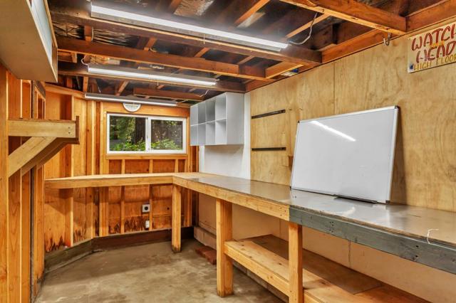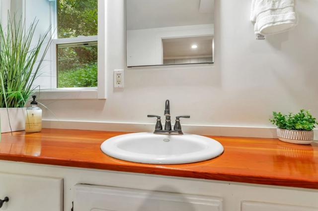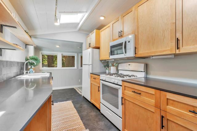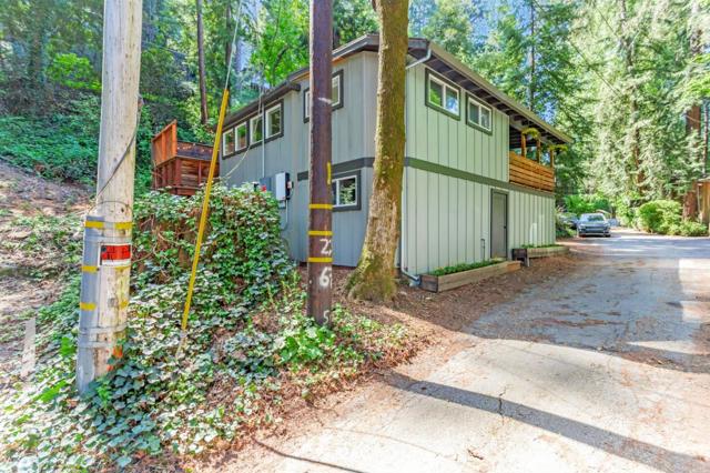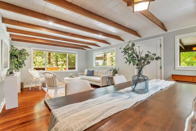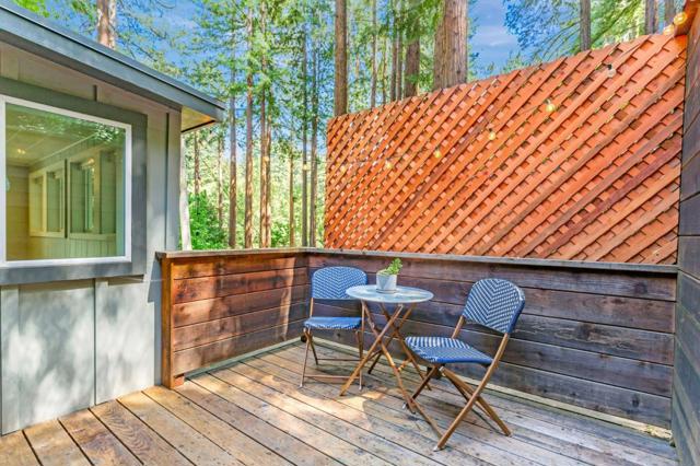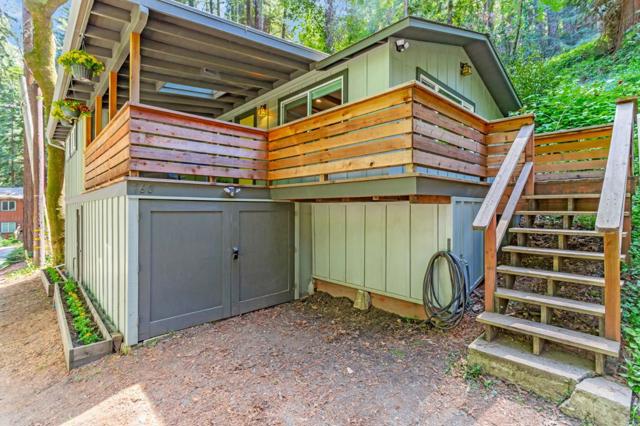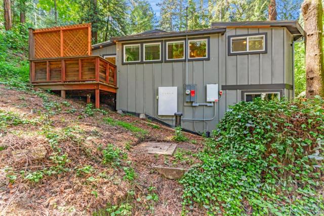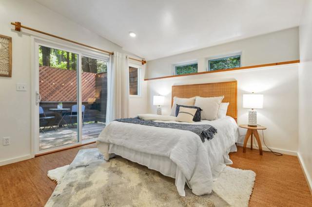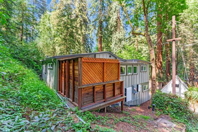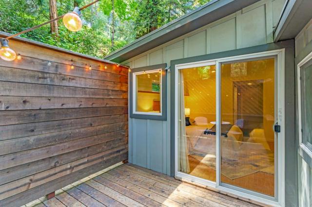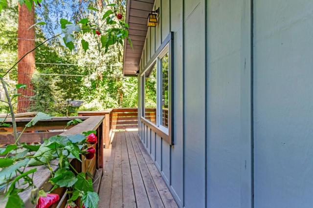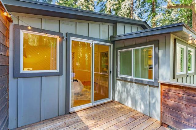 Super charming Ben Lomond home - this can be your place to truly relax and enjoy the Santa Cruz mountains & redwoods. This home was extensively remodeled circa 2019 and features gorgeous wood floors, exposed beam ceiling in the living room, skylights & double paned windows. Enjoy coffee on your inviting covered front porch and take in the views of the trees. The main bedroom has it's own private balcony, high ceilings & cork floors. The bonus room has brand new carpet, skylight and lots of windows to let in the light. The kitchen features a gas stove, skylight and plenty of counter space. There is a nook in the kitchen that has been used as a great office area. Under the home you will find a workshop area and extra storage. This is a charming retreat home with modern updates. Welcome home!
