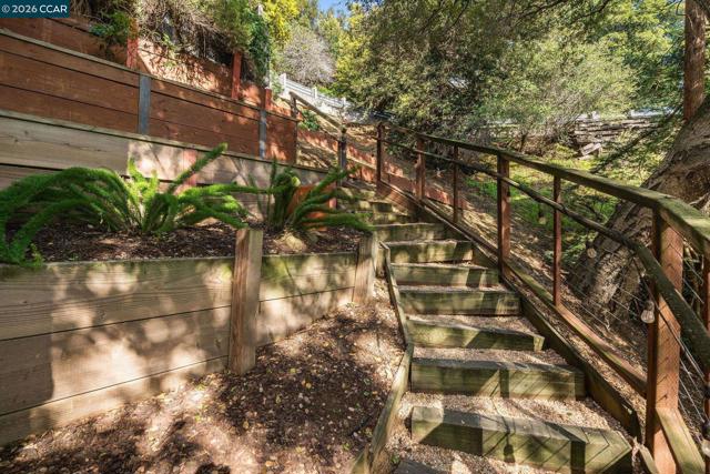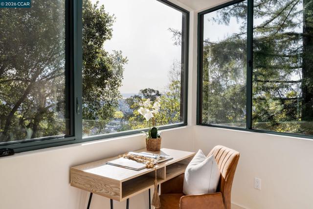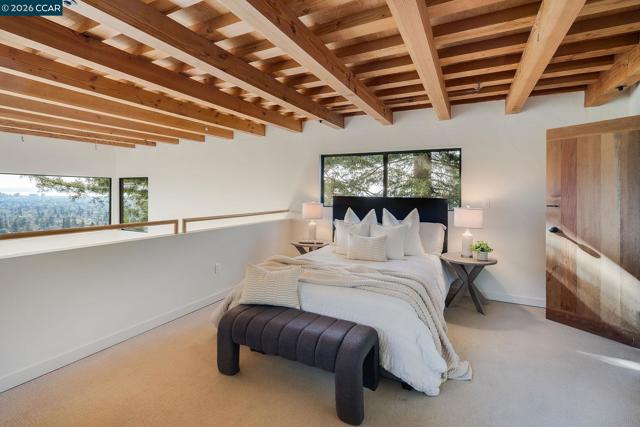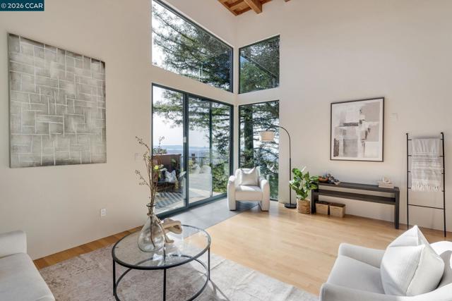 Tucked away in the Berkeley hills, this stunning 2012-built home offers the perfect blend of modern comfort and peaceful seclusion, surrounded by majestic redwoods and framed by breathtaking Bay views. Enjoy sweeping vistas of the Golden Gate Bridge, Oakland, and the San Francisco skyline through expansive wall-to-wall windows that flood the home with natural light. Soaring ceilings and beautiful custom woodwork create a warm, elevated feel throughout. A rare newer build for the area, this home offers privacy, nature, and convenience all in one, just a 10-minute walk to the UC Berkeley campus. Private parking above the home provides space for two cars, making everyday living easy in this serene hillside retreat.