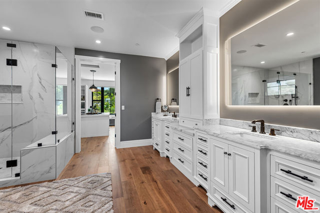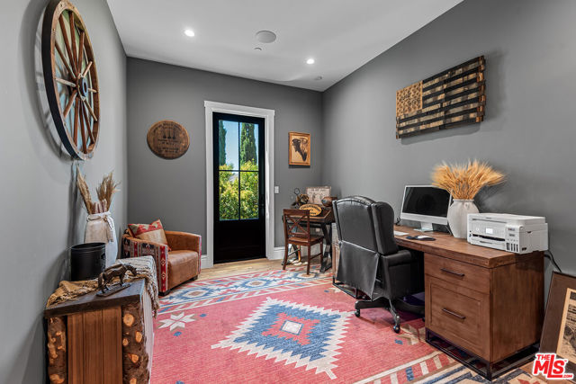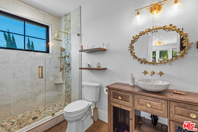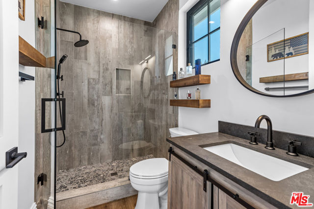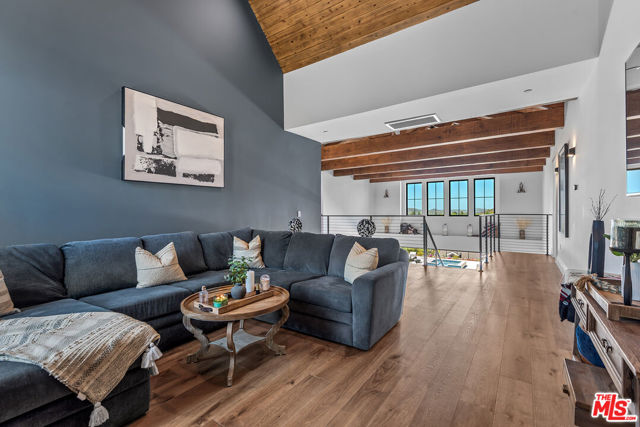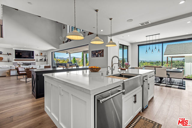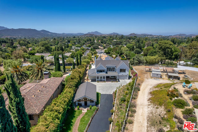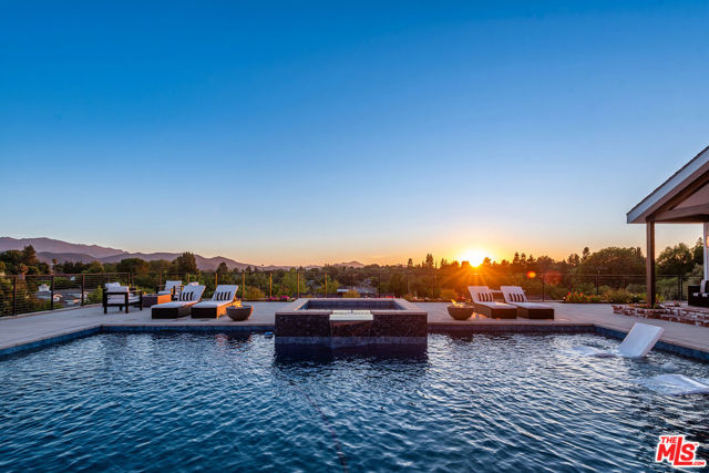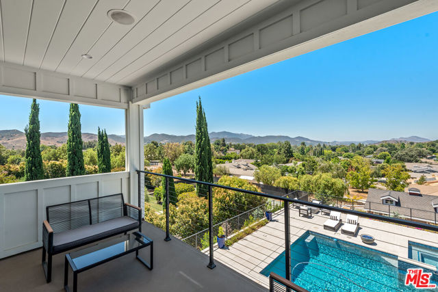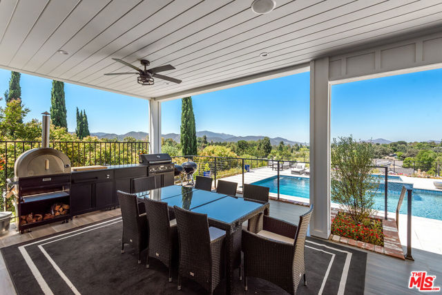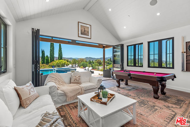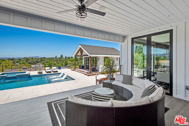 Experience luxury country living in this stunning modern farmhouse estate atop a gated acre in Thousand Oaks. With panoramic canyon and mountain views, this equestrian property blends rustic charm and contemporary design featuring 2story vaulted ceilings, wide plank floors, steel-framed windows, and designer finishes. The open layout connects a state-of-the-art chef's kitchen to light-filled living spaces with sliding pocket doors that lead to a resort-style backyard with pool, spa, fire pit, pool house, plus an outdoor kitchen with pizza oven, BBQ, and smokers. Wonderful primary retreat with sumptuous bath, large walk-in closet w/ center island and private balcony overlooking views. 3 additional en suite bedrooms upstairs. Equestrian amenities include fenced paddock, 2 unfinished barns ideal for tack room/horse stalls, and trail access. An office, maids/guest suite, mini putting green and a fully equipped 1 bed +1 bath rec room with kitchen completes this rare trophy estate just minutes from the city.
