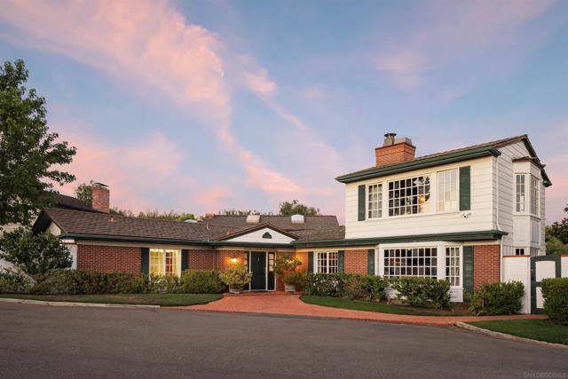 One-Of-A-Kind "Rancho La Jolla" Estate Property. Cherished by the same family for six decades, this extraordinary estate graces 1.23 prime acres. A rare opportunity to create your own legacy in one of La Jolla's most desirable enclaves nestled in privacy and seclusion. The grand, "Rancho La Jolla" estate features a 6,338 square foot classic Ranch Style residence surrounded by mature landscaping with multiple courtyards/seating areas to enjoy the serenity and quietude of the park-like-resort-style setting. See supp... Rancho La Jolla was tastefully remodeled over the years for the growing, 4th generation La Jolla family to take full advantage of San Diego's ideal indoor-outdoor climate and includes expansive windows and doors opening to the sun-drenched patios. Grand entertaining spaces include a formal living room, dining room, entry bar, music room, library, and executive office that complement the oversized Great Room family-kitchen-dining area, accented by Italian tile flooring. With six bedrooms and 4.5 bathrooms, the home the home lives like a single-story, and provides ideal spaces to entertain and retreat. Four gas and wood-burning fireplaces create a cozy and inviting ambiance. The gated, 3-car garage and motor court can be accessed from both La Jolla Rancho Road or Buckingham Road, providing an array of uses and development options for the new owners.