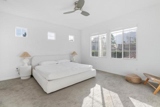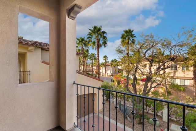 European-style move-in ready home in the coveted gated Pintura community with stunning San Jacinto mountain views located in the historic Araby Cove area of South Palm Springs. Professionally renovated by Flair Design and Build, Inc. in 2025 with architecture details inspired by the Balearic Islands, this two-level residence blends rustic elegance and low-maintenance living. The main level showcases a dramatic carbon-tiled wall gas-log fireplace, a custom media cabinet with a natural oak shelf, Italian travertine flooring, and a sophisticated kitchen appointed with taupe Caesarstone slab countertops, Spanish tile backsplash, natural floating shelves, stainless steel appliances, and a premium Sub-Zero refrigerator. The open layout creates an inviting flow for both everyday living and entertaining. Upstairs, the home features dual oversized primary suites, each with walk-in closets, and solar shades providing comfort and privacy. The main primary suite, office/loft area, and private balcony all capture breathtaking mountain views! Bathrooms upgraded with travertine flooring, showers, countertops, and custom oak-framed mirrors. Additional highlights include an attached oversized high-ceiling two-car garage with epoxy flooring. Residents of Pintura enjoy a charming Tuscan village ambiance with cobblestone streets in a secure gated setting at a low HOA, just minutes from downtown Palm Springs, PSP, renowned hiking trails, Koffi, and an array of popular neighborhood restaurants and cafes. This home is sold fully designer-furnished for a seamless, turnkey experience.