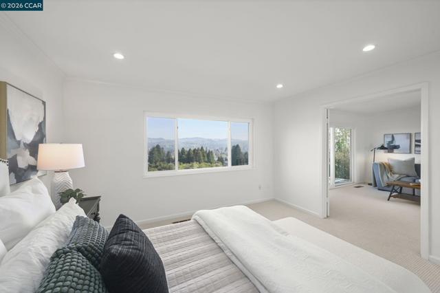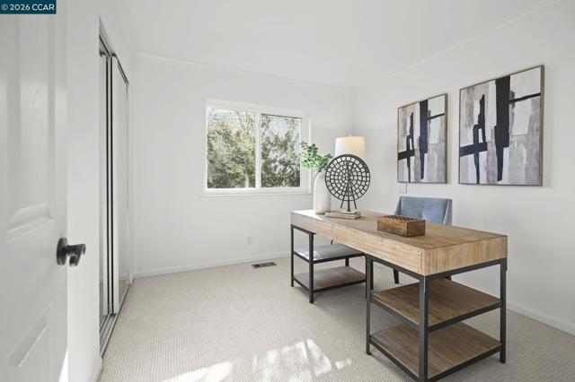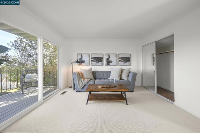 End-of-court privacy with sweeping Mt. Diablo and valley views in the highly sought-after Danville Ranch community. This light-filled 4-bedroom home offers scenic surroundings, comfortable living spaces, and low-maintenance living just minutes from downtown Danville. Expansive windows and tall ceilings capture beautiful views from the living room, dining room, primary suite, sitting room, and both patios, filling the home with natural light and a warm, inviting atmosphere. Freshly painted inside and out with brand-new carpet, the home feels bright, and move-in ready. Recently installed front and atrium decks enhance the outdoor spaces and provide inviting areas to relax, entertain, or enjoy the peaceful setting. The thoughtfully designed floor plan offers an easy flow for everyday living and gatherings, while a central atrium brings additional light and a unique indoor-outdoor feel. The primary suite offers a peaceful retreat with scenic views, and flexible secondary bedrooms provide space for guests, family, or a home office. Located within a neighborhood known for pride of ownership and served by nationally top-ranked San Ramon Valley schools, the home is just minutes from downtown Danville’s restaurants, boutique shopping, farmers market, and scenic hiking.