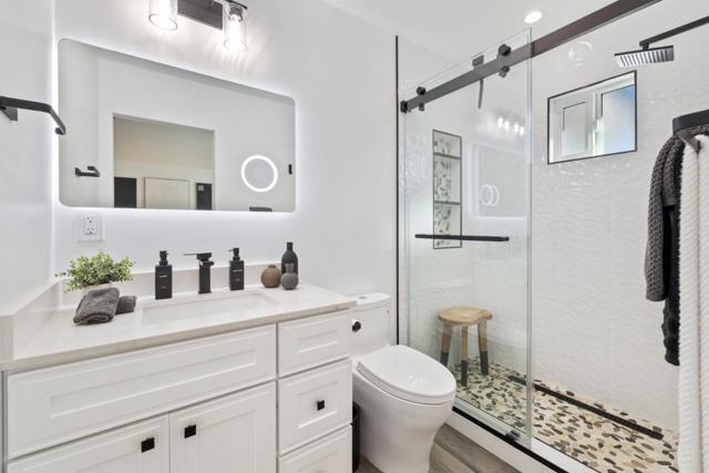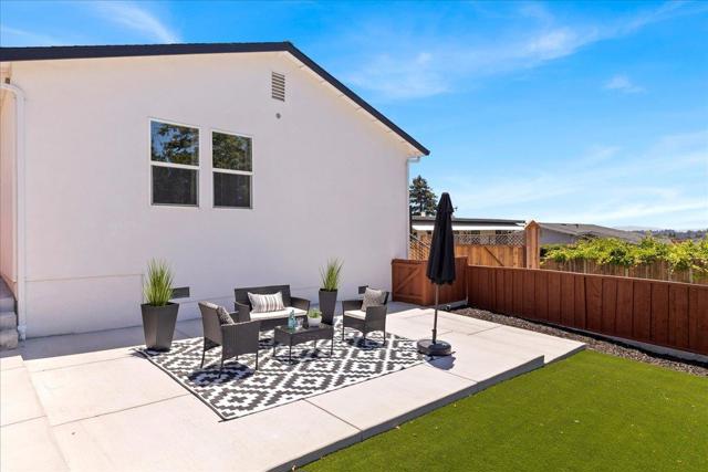 Experience modern elegance in this fully renovated 2024 architectural gem in Castro Valley. This 3-bedroom, 2-bathroom home offers 1,389 sq. ft. of luxurious living space on a 6,292 sq. ft. lot, designed with high-end finishes and expert craftsmanship. Step inside to recessed lighting, a statement chandelier, large picture windows flooding the space with natural light. Luxury laminate flooring and sleek barn doors add a contemporary touch. The custom chefs kitchen boasts top-tier stainless steel appliances, a custom pantry, and elegant finishes. Spa-like bathrooms feature LED mirrors with defogging and magnifying technology, matte black fixtures, and a rainfall shower. Custom closets enhance each bedrooms functionality and style. Sprinkler system with home hydrant system & fire bell. Built in security system. Relax on the TrekDeck balcony with stunning city views. Energy efficiency is ensured with whole-house insulation and a new HVAC system. Backyard is professionally landscape with low maintenance and drought resistant plants. Perfect for entertaining or private sanctuary. Top-rated school districts, Chabot Lake, Redwood Canyon Golf Course, and major freeways, this home offers both luxury and convenience. Make this your home!