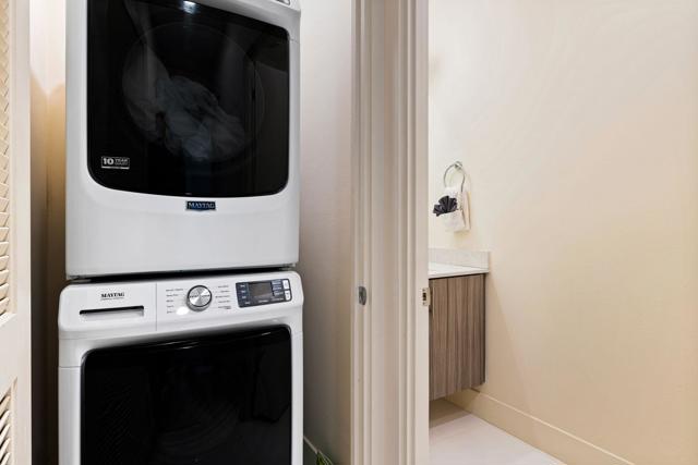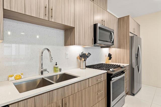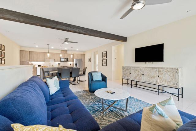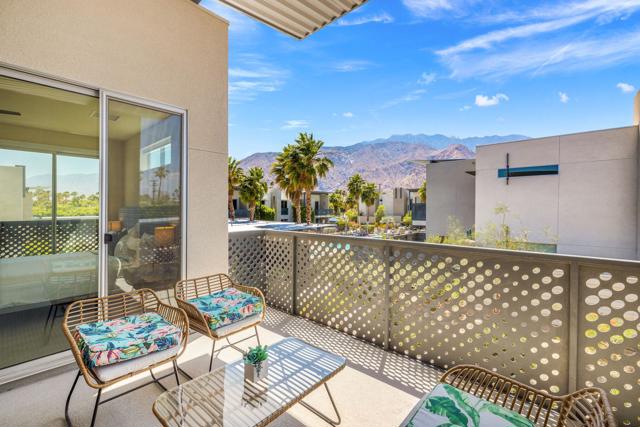 AVAILABLE STARTING DECEMBER 1 FOR ANNUAL LEASE. Newer construction 2 bed + 2.5 bath, luxury unit WITH GORGEOUS MOUNTAIN & POOL VIEWS from the patio and the master bedroom! Enjoy open concept living in the spacious Great Room/Living/Kitchen/Dining area, 9' ceilings with exposed beam, 8' tall sliders onto patio, clerestory windows, quartz countertops, custom cabinetry and upgraded large format tile floors. Both bedrooms have their own full bath and there is a powder room for guests. Convenient in-unit, full size washer and dryer & dual ceiling fans in dining and livIng room. Close to downtown Palm Springs and all the action. The gated community includes resort style pool/spa, poolside fire feature and seating area, outdoor grills and dog park.