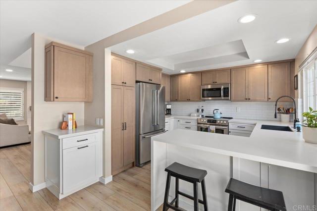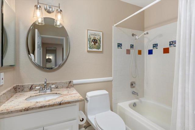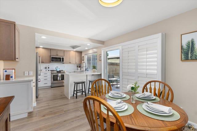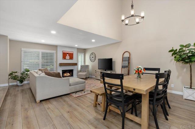 Pride of ownership shines in this remodeled, 3 bedroom, 2.5 bath, 1,492 square foot townhome with a private backyard and attached two-car garage. The home is thoughtfully upgraded with CoreTec luxury vinyl plank flooring, recessed lighting, plantation shutters, and central AC, plus a brand-new roof for peace of mind. The welcoming front patio leads into a light-filled living room with high ceilings and a fireplace, flowing seamlessly to the dining area and kitchen. The remodeled kitchen is warm and pristine, showcasing updated cabinetry, quartz countertops, stainless steel appliances, breakfast bar seating, and a lovely kitchen nook that opens to the large backyard patio and two-car garage. Upstairs, the primary suite offers a private balcony, en suite primary bath with dual sink vanity, and walk-in shower. The second floor is complete with two spacious secondary bedrooms with ample closet space, and a beautifully finished additional bath with shower-bathtub combo. Enjoy amenities within the tight-knit Vida Pacifica community, including a recently resurfaced pool and spa, and a playground. Ideally located 3.7 miles from the beach and downtown Encinitas, and just minutes to Flora Vista Elementary, Diegueno Middle School, Trader Joe’s, Sprouts, Target, parks, and favorite local coffee shops and restaurants. This inviting townhome combines comfort, convenience, and coastal living in the heart of Encinitas.