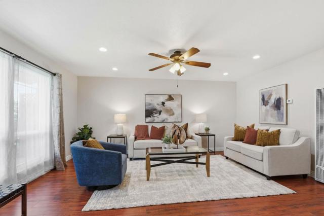 Experience the perfect blend of comfort & convenience in this move-in ready home. Radiating pride of ownership, this residence shines with fresh interior paint, sleek laminate flooring, & energy-efficient dual-pane windows throughout. The heart of the home is a spacious living room bathed in natural light from a large front picture window, complemented by recessed lighting & ceiling fan. The updated kitchen features freshly painted cabinets, tiled counters, a gas range with new stove vent, dishwasher, & refrigerator. The dining area, enhanced by a sun tunnel, with sliding door to your private outdoor space. Both bathrooms have been beautifully remodeled, including a serene primary bath with an espresso vanity, granite counters. Hall bath is also nicely appointed. Step outside to low-maintenance yards and a lovely covered patio, perfect for shaded lounging. Highlights include a 2-car garage with epoxied flooring & laundry area. The location is unbeatable: just steps from Meadows Elementary and Turtle Rock Park. Commuters enjoy effortless access to I-101 and 280/680 freeways. This prime spot is within a 5-minute drive of the Tully Road retail corridor and Grand Century Mall, with local churches & temples in close proximity. This is the turn-key home you've been waiting for!