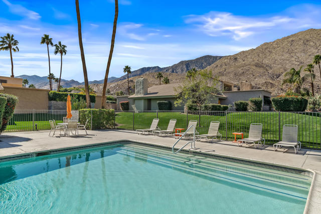 Just Reduced ... Make an Offer. Discover the epitome of modern desert living in this revitalized 2-bedroom, 3-bath townhome, now being offered fully furnished. Embrace the elegance of a classic 1979 Hugh M. Kaptur design while enjoying contemporary upgrades that blend luxury with comfort. The inviting step-down living room, adorned with a cozy gas fireplace, opens through sliding glass doors to a generous patio. Here, you'll bask in the serene views of mature citrus trees, all while gazing at the sparkling community pool and spa. The kitchen is a chef's wonder, featuring sleek stainless steel appliances and ample counter and storage space, perfect for any culinary endeavor. Each bathroom has been thoroughly modernized, including the conveniently located powder bath on the main floor. Upstairs, you'll find two sunlit ensuite bedrooms. The primary suite offers a personal retreat with a gas fireplace, a wet bar, three closets (one cedar-lined), and breathtaking mountain views from it's spacious balcony. Newer tile flooring and freshly painted walls stretch throughout, adding an exciting stylish touch to the home. Nestled in the sought-after Canyon West Estates of South Palm Springs, this townhome is only minutes away from downtown Palm Springs' vibrant dining and shopping scene, with easy access to nearby hiking and biking trails. Experience the perfect blend of relaxation and excitement in a pet-friendly, vibrant, and secure gated community. Your ideal desert lifestyle awaits!