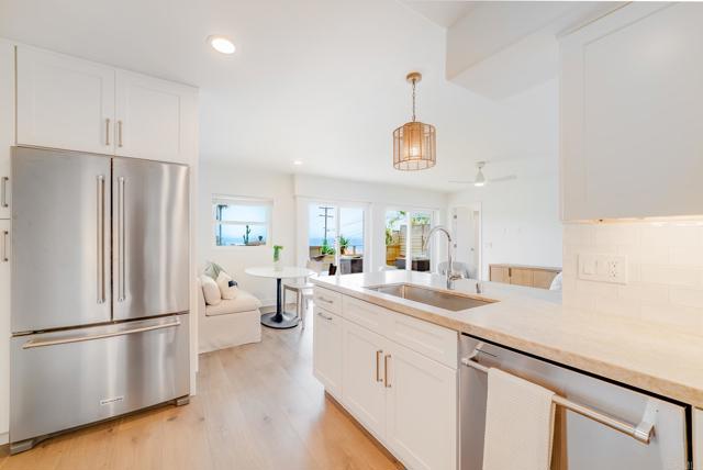 Discover the ultimate coastal treasure at 231 5th Street, Encinitas, CA—truly a real-life unicorn in the world of real estate! This 3-bedroom, 2-bathroom sanctuary spans nearly 2,000 square feet, seamlessly blending modern luxury with stunning beach and whitewater views that greet you from every angle. Just steps away from the sands of Moonlight Beach, one of San Diego's most cherished spots, this home has been fully remodeled and is completely turnkey. This incredible home has the ability to be a single family home with a detached garage/studio and yard or two separate units, one upper and one lower, to provide the potential for multi-generational living or a nanny suite under the same roof. Each unit contains fully equipped updated kitchens with premium stone counters and sleek stainless appliances, fully renovated bathrooms, and private living space. Perfect for when you want family living while maintaining privacy. Or if you choose, long-term rental possibilities are an option. The detached garage is still under renovation, complete with a full bathroom, washer/dryer and studio kitchen. A roof top deck will capture all of the action at Moonlight beach and fantastic sunsets. This space could be a garage, studio, office, workout room, storage, etc. Step outside into your private oasis, where a brand new hot tub and beautiful outdoor spaces await. Enjoy the expansive deck and balcony, each offering breathtaking vistas. Copper rain gutters add a sophisticated touch to the exterior, while the interior shines with dual pane windows, hardwood floors, and recessed lighting. Additionally, parking is convenient with a detached garage, guest parking, and accessible street parking. This exceptional property is ready to be all yours, offering a lifestyle that’s both luxurious and relaxed. Don’t miss out on this rare opportunity—fully furnished and waiting for you to make it your own slice of paradise!
