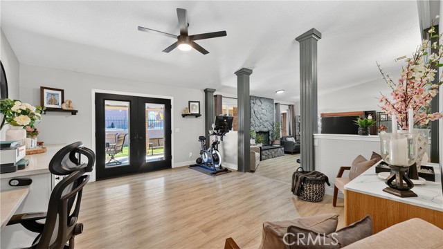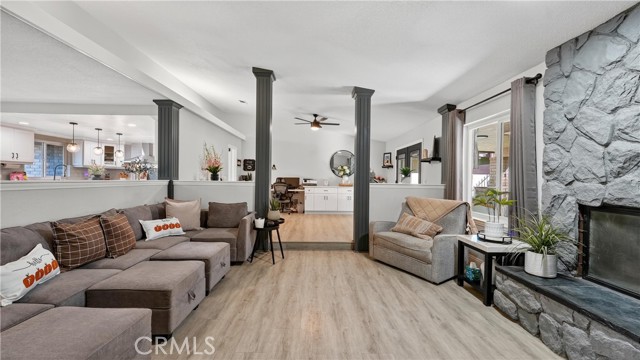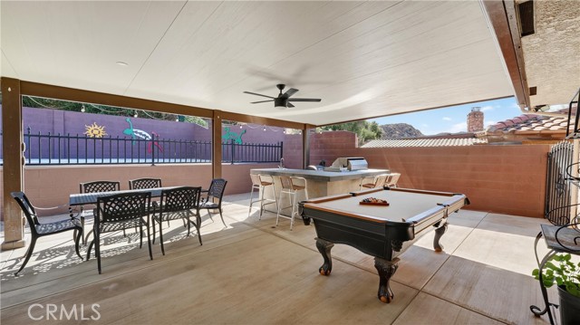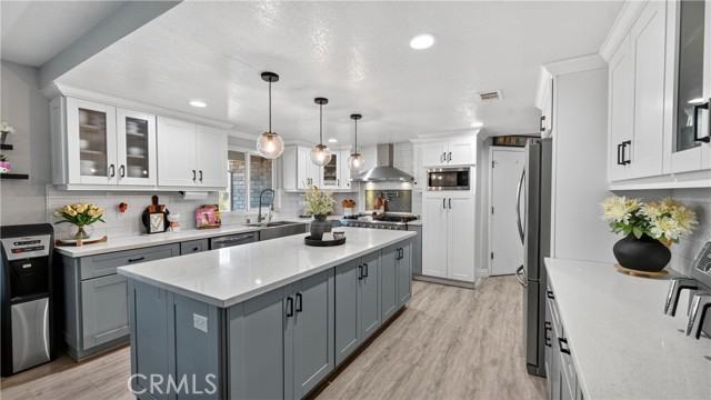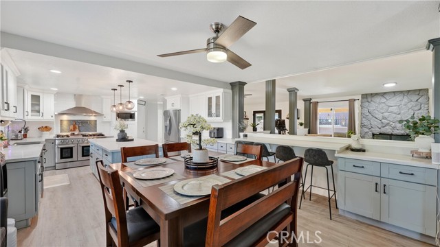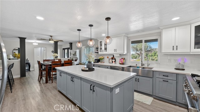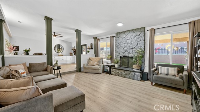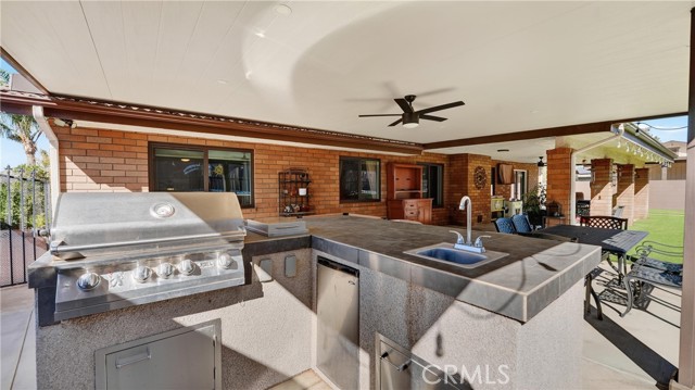 Discover 2,487 sq ft of fully remodeled bliss on a massive lot, framed by the San Bernardino Mountains. This single-story gem delivers open-concept living, boundless storage, and an epic entertainer's backyard – perfect for families and fun. Golden natural light pours through energy-efficient windows into a soft neutral palette, where luxury vinyl plank flooring flows throughout and central AC/heating ensures year-round comfort. The chef's kitchen shines with sparkling quartz counters, a large center island, 48" double oven, with a swing arm pot filler faucet, stainless steel appliances, farmhouse sink, and crisp white shaker cabinets under chic globe pendants. It flows seamlessly to the dining area with built-in hutch and family room anchored by a dramatic stone fireplace. Four spacious bedrooms feature ceiling fans and ample closets, paired with 2.5 spa-inspired bathrooms offering dual vanities, frameless glass showers, subway tile, with modern fixtures. A private indoor laundry adds everyday ease. Storage is unmatched with a 565 sq ft attached garage (220 sub for welding) plus a massive 3-car detached garage with a custom built (12x25 alumawood carport) – perfect for RVs, boats, workshops, or home gym. The backyard oasis captivates under a covered patio with string lights, built-in outdoor kitchen (gas grill, sink, bar seating), regulation pool table, bubbling spa, fire pit seating, 4 large storage sheds, artificial turf lawn, mature citrus fruit trees, dog run, paver paths, secure fencing, and stunning mountain views. Curb appeal dazzles with a durable tile roof, swaying palms, terraced drought-tolerant gardens, and grand entry staircase. Nestled on a quiet street near top schools, parks, hiking trails, shopping, dining, and freeways. Move-in ready with newer windows, electrical, plumbing, lighting, HVAC and solar-ready panels. This rare Riverside treasure won't last. Schedule your private showing TODAY!