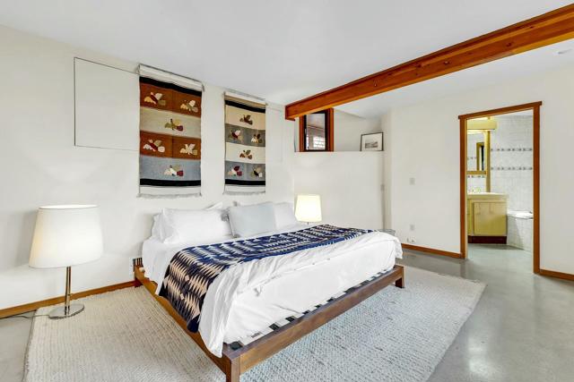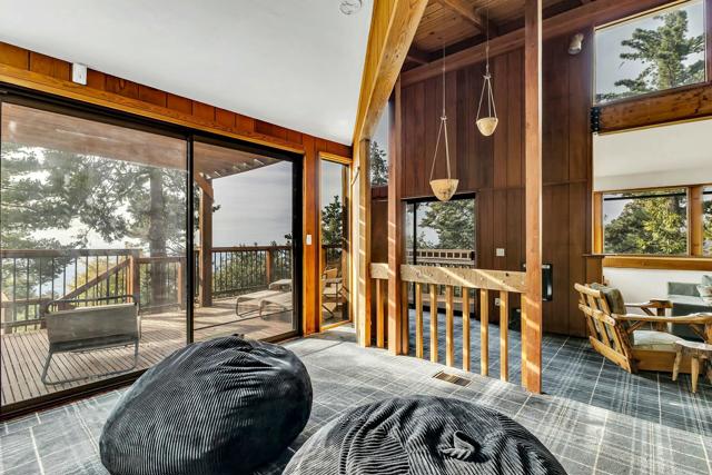 This architectural gem, designed by renowned architect Dennis McGuire as his first project in Idyllwild, CA, is a breathtaking masterpiece anchored and pinned to massive granite boulders, some of which grace the interior of the home. Clad in Simpson Redwood plywood with resawn redwood accents inside and out, the home seamlessly blends natural elements with modern design. Expansive views span from Mount Wilson-aligned with the summer solstice sunset-to Mount San Gorgonio and Black Mountain. The main level boasts a light-filled kitchen with tiled counters, a dining area, and a living room with soaring ceilings, a dramatic fireplace, and unparalleled vistas. The primary bedroom opens to a private deck for peaceful mountain moments. A lower-level guest room, featuring a cozy bay-like nook framed by glass, offers space for an office or serene retreat. Relax in the skylit shower, soak in the top-quality hot tub, or unwind on multi-level decks surrounded by nature. This rare visual jewel invites you to experience a harmonious balance of nature and design.